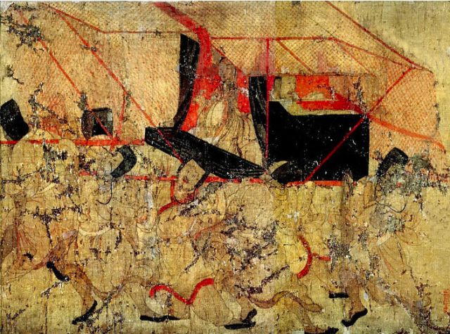 其实,《女史箴图卷》源于《女史箴》,而《女史箴》又源于西汉末刘向的《列女传》,就是说与司马金龙墓屏风漆画不仅艺术近似,题材相承,其内容必然有一定的联系。《女史箴图卷》和司马金龙墓屏风漆画中的“班婕妤辞同辇”,题材一样,构图更为相仿。