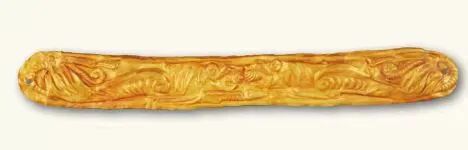 金器柄原为长柄木勺的柄部,用金片捶揲成格里芬形。格里芬大眼睛,勾喙,长颈,头部和颈部装饰涡纹,翅膀和尾巴结合部位装饰有格里芬头。根据推断,这件长柄木勺的直径为 15 厘米,高 9.5 厘米。