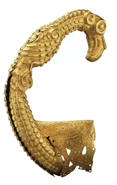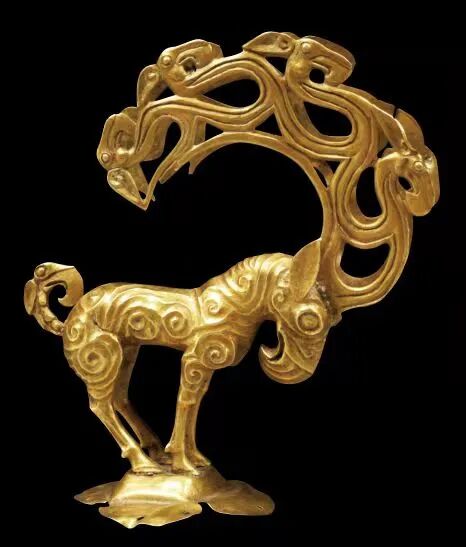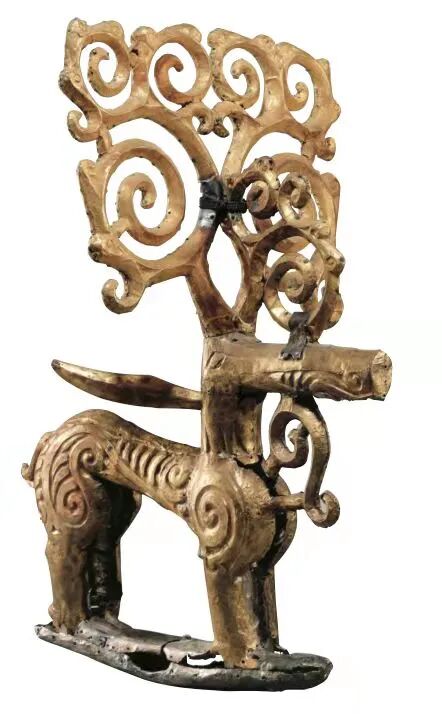 (图 8)巴泽雷克 2 号冢墓出土的木雕马头饰上格里芬口中吞噬的鹿形神兽形象更具有幻想特色,其枝杈状的大角末端装饰着勾喙鸟首(亦说是格里芬头),神性特色更加突出。(图 9)彼得大帝的收藏品金项饰上的兽纹,在尾巴末端装饰勾喙鸟首(图 10),菲利波夫卡 1 号库尔干出土的包金鹿的大角上装饰的勾喙鸟首(图 11),这类纹样就是用写实加幻想的手法进行表现的。