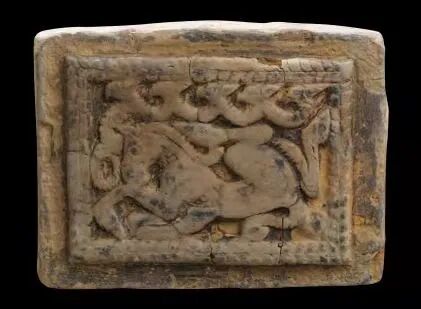 出土于一位秦国名“苍”的铸铜工匠墓葬中,同出的还有其他类型的陶模具。为长方形腰饰牌的模具,上有 3 个长方形小凹槽,背面附有草拌泥。以该模具铸出的腰饰牌带有绳索纹边框,内装饰一后肢朝上反转的蹄足神兽,神兽头生大角,角上装饰有带耳的勾喙鸟首,尾端也装饰有带耳的勾喙鸟首,神兽肩部和臀部装饰有螺旋纹。在神兽鼻部有一椭圆形孔,是腰饰牌的系结用穿孔。用这件具铸造的腰饰牌与宁夏固原三营乡出土的长方形神兽纹金腰饰牌基本相同,区别只在于三营乡出土的腰饰牌神兽嘴部还能看出是勾喙,这件陶模具上的神兽勾喙基本消失,表明这件陶模具的年代比三营乡出土的腰饰牌年代稍晚。到西汉时期,这种头生大角、后肢朝上反转的蹄足神兽变成马身,头上的大角也变得让人很难辨认,表明西汉时期的工匠已经不能很好地理解和把握这种神兽纹样原本的特征与含义,只是把其当作一种装饰纹样来对待,因此,有角蹄足神兽原本具有的神性等宗教内涵被忽略。