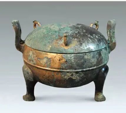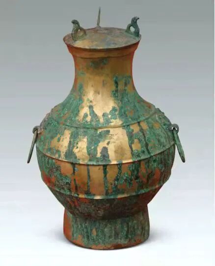 侈口,方唇,长束颈,肩部有衔环铺首一对,鼓腹上饰凸弦文 3 道,高圈足。带盖,盖上有 3 个鸟形捉手。共出土 2 件。鎏金青铜壶是中原文化特色的酒器,与壶同出的中原文化器物还有鎏金青铜鼎、青铜戈、错金银铁车軎、青铜盖弓帽等。M1 于马家塬墓地的中心位置,距离该墓地最大规模的 M6 很近,为带有9级阶梯式墓道的竖穴洞室墓,随葬有 5 辆装饰豪华的礼仪车辆、数量较多的中原文化的青铜礼器以及来自西方文化的物品,说明墓主生前拥有很高的社会地位。战国中晚期之前,马家塬地区不见以车乘和中原青铜礼器随葬的墓例。战国晚期,该地已被纳入秦国的势力范围,开始流行以车乘或车器及中原青铜礼器随葬。以随葬车乘和青铜礼器来标识死者身份等级的做法是中原文化的传统,马家塬墓地以随葬车乘和中原文化的青铜礼器来标识墓主身份等级的做法应是受中原文化影响的结果。