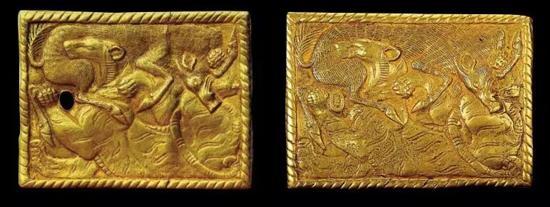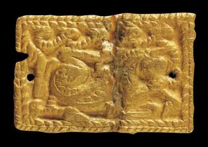 中国北方地区出土的带绳索纹边框、框内装饰动物咬斗纹样、背面有固定用钮的长方形腰饰牌并不是草原文化特色的物品,金腰饰牌铸造成型,与草原上流行的捶揲成型工艺不同,腰饰牌的固定方法和系结方法也与草原民族流行的带扣舌的腰饰牌明显不同,应当是以秦国工匠为代表的中原工匠吸收借鉴草原文化因素的新创作。(图 28、29)这类长方形腰饰牌出现于战国晚期,当时主要流行于中国北方地区,佩戴者多是草原部族的首领(图 30),应是以秦国为代表的中原国家为其统治下的草原上层人士颁发的身份标识物,而不是作为与北方草原部族进行贸易的商品。