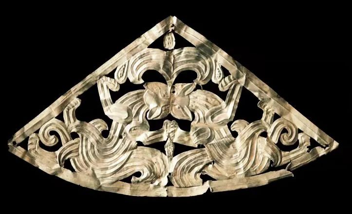 以薄银片锤揲而成。饰片呈扇形,边框顶端各有一个钉孔。扇形边框内中部饰两只虎,两只虎的头部与一只前后爪腿相抵。虎的后肢朝上反转,是欧亚草原后肢反转动物纹样向中国北方地区传播的结果。从甘肃张家川县马家塬墓地出土的类似物品看,扇形虎纹银饰片应为车轮上的装饰品。
