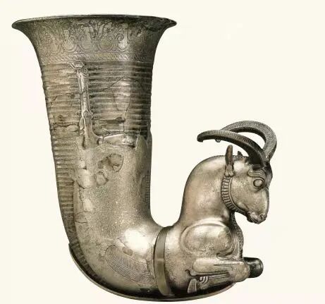 银来通由两部分组成,上半部分为角形的饮酒杯,下部为一头前肢屈跪的小牛前半身,两部分连接起来后,角杯下部成为小牛的后身,角 杯下端两侧有线刻的翼形纹样。这件银来通具有波斯典型风格,属于阿契美尼德王朝的制品。菲利波夫卡 1 号库尔干被推测为萨尔马泰人 的墓葬,这件波斯风格的银来通证明了萨尔马泰游牧人与阿契美尼德王朝之间的文化交流。