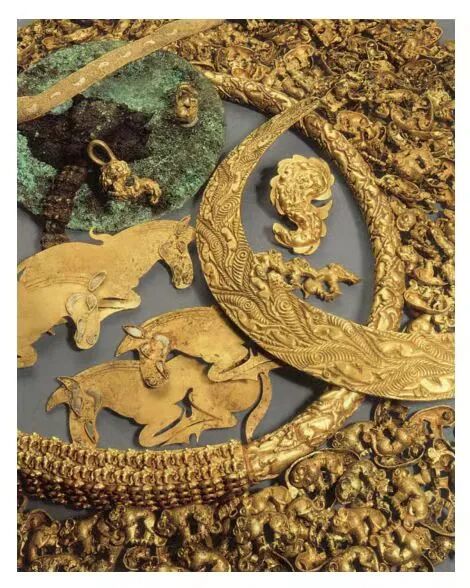 由武士精英构成的上层贵族集团掌控着欧亚草原丰富的资源,过着极度奢华的生活。他们对贵重的黄金情有独钟,生活中使用大量的金器,从头到脚都装饰着各种金饰,随身佩戴的刀剑上常常镶嵌有黄金,剑鞘外也包裹着纹样繁复的金片。这些草原精英贵族坚信他们的富贵奢华生活可以在阴间继续,常常把数以千计的豪奢金制品带进坟墓。免遭盗劫厄运的图瓦阿尔然 2 号库尔干出土有 5600 余件、重达 20 千克的各种黄金制品(图 4),伊塞克“金人墓”出土有 4000余件金器,死者为萨迦贵族,几乎被黄金包裹着,被称作“金人”(图 5)。还有数量众多的早期铁器时代游牧人的库尔干虽然历遭盗劫,仍然出土了不少金器。(图 6)即便是普通武士也常以各种青铜制品作装饰,青铜的本色类似黄金,繁复的青铜装饰同样可以标识佩戴者的身份地位,也能呈现出金灿灿的效果。由于大量金器和青铜制品的出土,早期铁器时代的欧亚草原被赋予“黄金草原”的美誉。