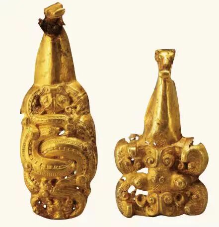 短带钩为长颈龙首,凸目、隆鼻、牛吻、卷须、弯角,钩身方形,正面高浮雕兽面,兽面有球形凸眼,眉、鼻、嘴呈卷云纹状,额、耳及面部轮廓边缘饰连珠纹,四角勾起的尾部饰羽纹,背面残存锡块,钩、身连接处开裂,身面局部微残。长带钩为长颈兽首,造型似熊首,钩身椭圆形,正面高浮雕雌雄双龙缠绕图案,上端龙首圆大,双耳高竖,环眼圆凸,两眉对称斜弯呈八字形,方鼻,吻高凸,两侧卷须上翘,口部咬噬龙身,双爪扣锁龙身;下端龙首较小,呈三角形,圆耳,高凸目,额心圆珠纹,短鼻,椭圆形吻部,卷须,口噬龙身,双爪扣锁龙身,双龙身躯缠绕,饰云雷纹、联排珠纹、凹窝纹、卷云纹等,背面残存大量锡块,颈部包裹条形弯钩铁胎,锈蚀膨胀后致使钩首金面开裂。带钩是中原文化特有的腰带组件,马家塬墓地出土的带钩体现了中国北方地区草原文化与以秦文化为代表的中原文化之间的交流与融合。