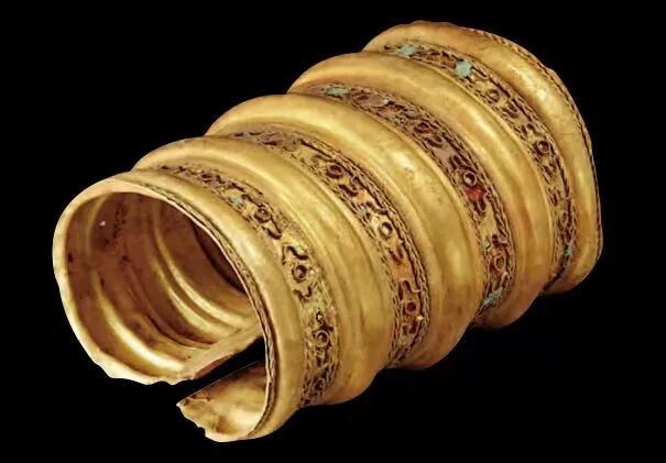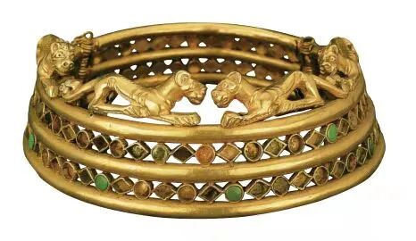 阿尔然 2 号库尔干所在地被称作“国王谷”,发掘者是俄罗斯-德国联合考古队。该陵墓封丘直径 80 米,高 2 米多,死者为一对夫妇,男性死者年龄约 40—45 岁,女性死者年龄约 30—35 岁,他们衣着华丽,帽子上装饰有动物纹金饰,脖颈上佩戴有直径 23.6 厘米、重达 1500克左右的金项圈,外衣上缝缀有 2500 多件豹形金饰片,属于游牧上层精英阶层。该库尔干未遭盗掘,出土9000 多件随葬物品,其中有 5600余件金制品,总重量约为 20 千克,包括项圈、各种动物纹金饰等,是目前欧亚草原出土物品最为丰富的一座陵墓。