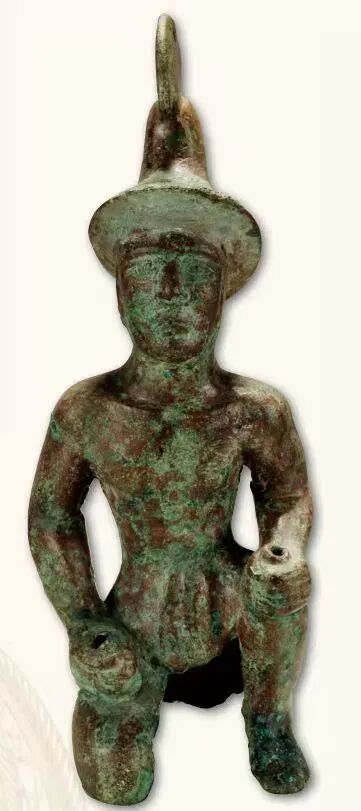 合模浇铸而成 , 中空。武士深目高鼻,头戴高高的弯钩尖顶宽沿大圆帽,上身赤裸,单膝跪地,双手原应握有兵器,表情端庄,双目凝视前方,呈准备投入战斗状态。从形象判断其很可能是生活在新疆地区的塞人。塞人属于欧罗人种,希腊、罗马人称其“Saka”,波斯人称之为释迦、烁迦,印度人称之为释种,《史记》和《汉书》中称之为“塞人”。塞人公元前 3 世纪以前生活在美丽富饶的伊犁河流域及伊塞克湖附近一带 , 以游牧为主 , 后被大月氏所败 , 迁徙至今中亚地区,与当地民族逐步融合。他们分为三大支系,其中一支以头戴尖帽为特征,被称作“尖帽塞人”。该武士像表现的应当是尖帽塞人。作为游牧民族,塞人在早期东西方文化交流中起到重要的桥梁作用。战国时期中原丝绸、铜镜等的西传应当就有塞人的贡献。(编者语:也有像亚历山大马其顿士兵一说)