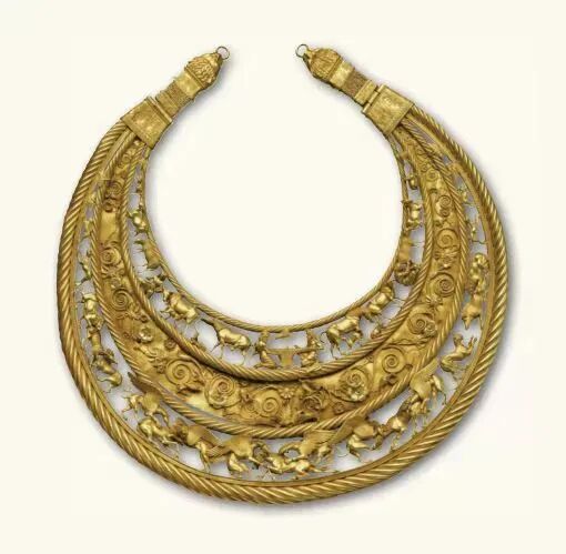 金项饰为著名的彼得大帝收藏品,1716 年 12 月 12 日,由西伯利亚长官马杰维·加加林王子献给彼得大帝。由三根中空的圆金管组成,金管之间有菱形和圆形装饰,菱形和圆形装饰内镶嵌有绿松石和珊瑚。项圈分为前后两部分,前面部分大,后面部分小,前面部分上端附有四肢蹲踞形的虎形神兽,神兽中空,尾巴末端装饰有勾喙的鸟首。