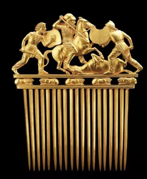 金梳子发现于墓主右肩附近,有 19 根梳齿,梳子上部用圆雕技法描绘了激烈的战争场景。斯基泰人是游牧的骑马民族,他们能征善战,强悍勇猛。梳背上的武士身穿希腊和当地风格相结合的盔甲,中间骑马者背着椭圆形的盾牌,左手执缰绳,右手持矛,正刺向其前方的人。被刺者身披盔甲,左手执盾,右手持短剑,与骑马者进行殊死搏斗,他的战马仰卧在地,已死。骑马者身后跟着一名披发的武士,武士左手执盾,右手持短剑,腰间悬挂箭 ,仿佛正要悄悄靠近并袭击骑马者。战争场面的表现手法具有明显的希腊风格,很可能梳子是由生活于黑海北岸地区的希腊工匠为斯基泰人设计制作的。