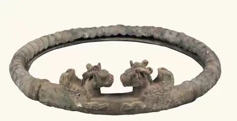 铸造成型,环体中空,内侧有一条开口,表面起凸棱纹 , 上铸有两只相对的带翼神兽,神兽头生卷曲后伸的双角。从造型和功能看,该环应为宗教仪式中使用的器物。带翼神兽早在公元前三世纪就已出现在两河流域,并向世界各地广泛传播。这件青铜环具有明显的西亚风格,当是文化交流的结果。