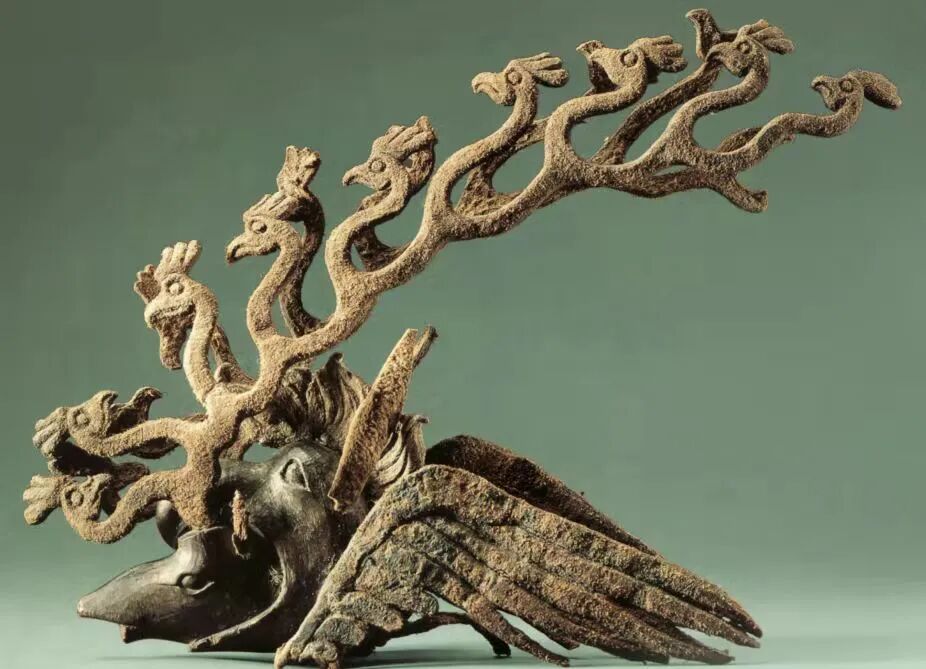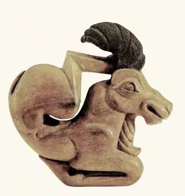 神兽头生尾端带勾喙猛禽头的大角,尾巴上翘贴在背上,尾巴末端带有勾喙猛禽头。这种造型的神兽在中国北方地区战国晚期的遗存中有较多的发现,尤其以甘肃和宁夏地区为多。较早的该类型神兽纹样出土于黑海北岸库班河流域艾里扎维托夫斯卡16 号库尔干,时间为公元前 5 世纪晚期—前 4 世纪早期,该库尔干属于斯基泰人的墓葬。中国北方地区的这种神兽纹样应是对欧亚草原上流行的这类神兽纹样的吸收与借鉴。