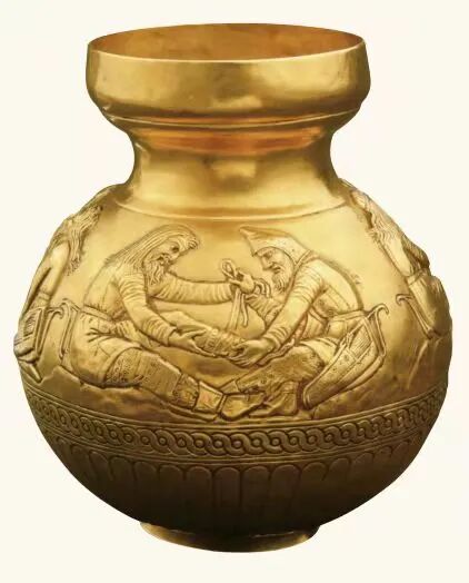 斯基泰贵族墓葬中出土的奢华金器带有浓郁的希腊风格,这些金器多出自希腊工匠之手,不少金器是希腊工匠专门为斯基泰人制作的。(图 13)斯基泰人不仅与希腊人保持密切的文化交流,与伊朗高原的阿契美尼德王朝之间也存在着较密切的联系。阿契美尼德王朝的物品常常出现在斯基泰人的墓葬中。(图14)这些物品或是通过贸易,或是通过战争所得。此外,斯基泰人通过生活在阿尔泰和乌拉尔山区的游牧人,获得来自东方的物品(如中国内地的丝绸、铜镜、漆器等),并将这些物品转卖给周邻的希腊人或地中海沿岸的其他居民。同时,他们也把产自地中海一带的物品如蜻蜓眼玻璃、毛织物等转卖到东方。