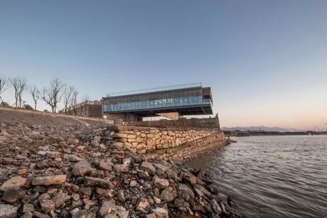 本项目是利用江边的一座废弃码头,建造一个全公益性市民书屋。毛石和混凝土砌筑的码头长宽约40米*14米,设计中32*14米的书屋主体钢结构框架被6根钢筋混凝土柱子支撑在码头上,架空建筑形体的底层为原有码头空间,中层是书屋的阅览空间;顶层是观江平台。