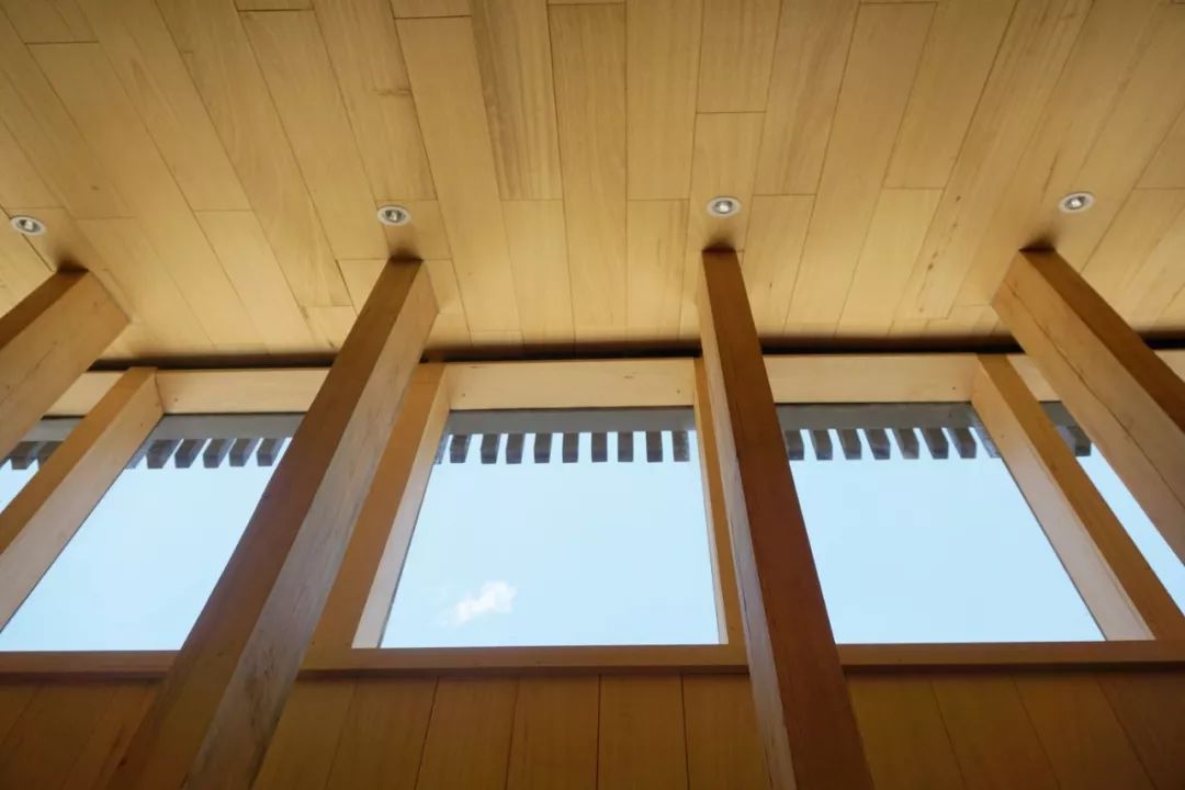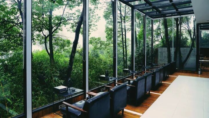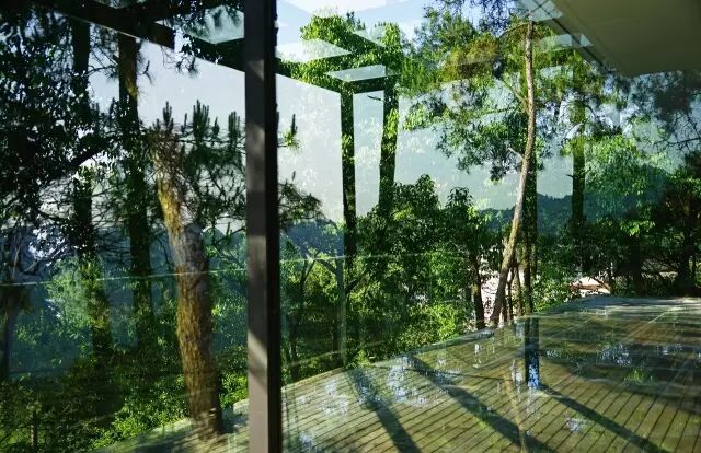 天气晴好的时候,玻璃窗上映出云与水;天阴的时候,则好像一副水墨画,在雨中安安静静地待人欣赏。