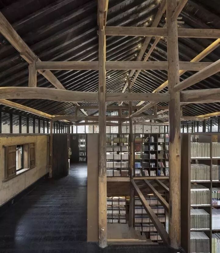 这座吐纳于云夕之间的图书馆,位于海拔600多米的桐庐县莪山乡新丰民族村戴家山,隐匿于一片黄泥房中。图书馆由两座毗邻的畲族民居改造而成。改造后的图书馆,依旧保留了古老民居的木石结构,一幢为艺术咖啡馆,一幢为图书馆和活动空间。