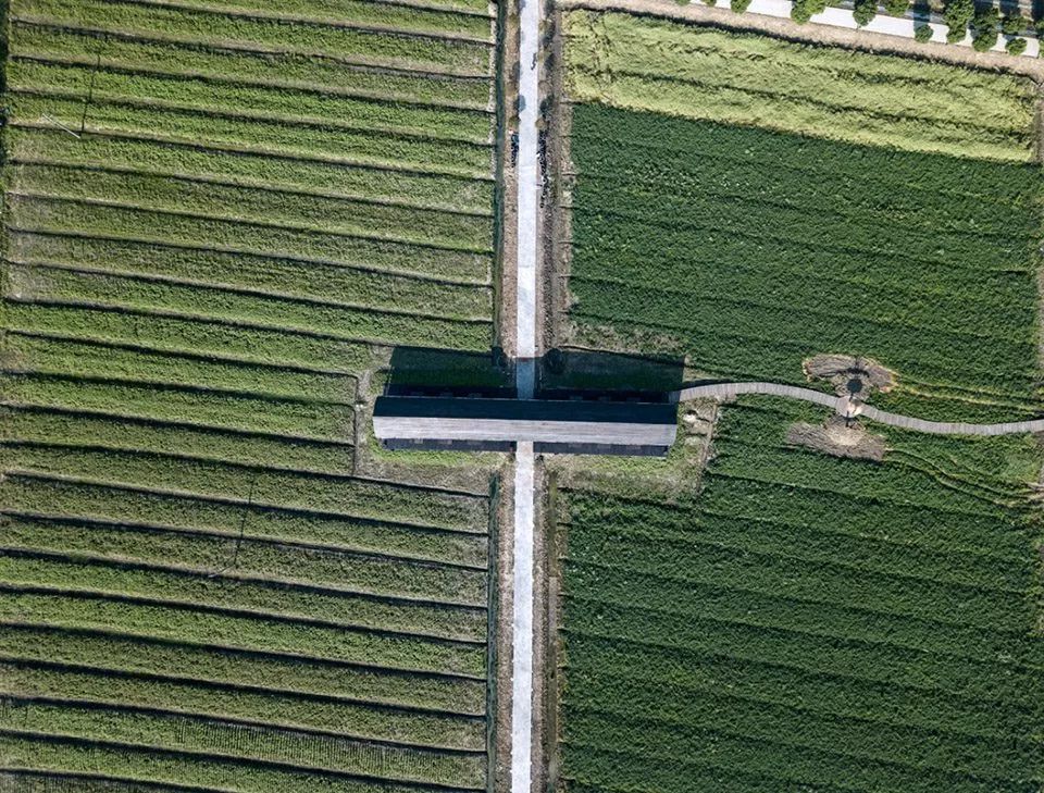 ▼图书馆安安静静得躺卧在田中央,成“一”字形