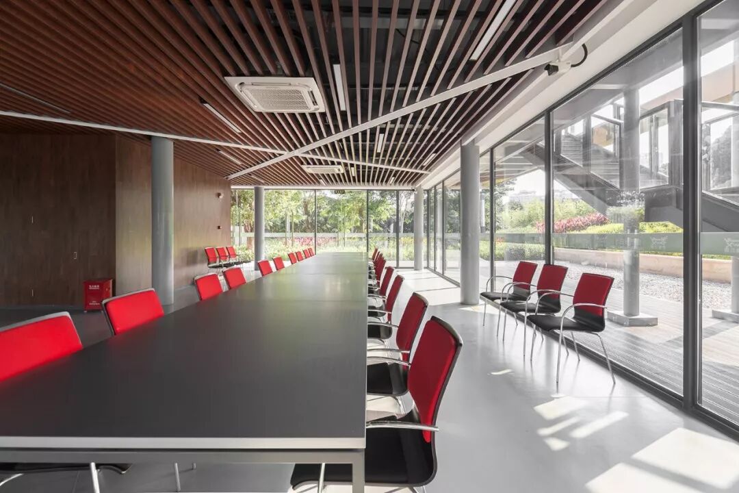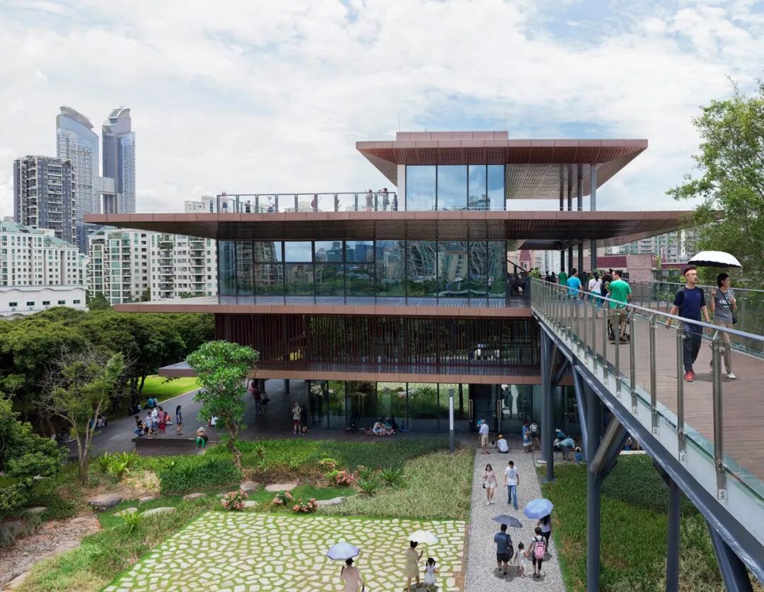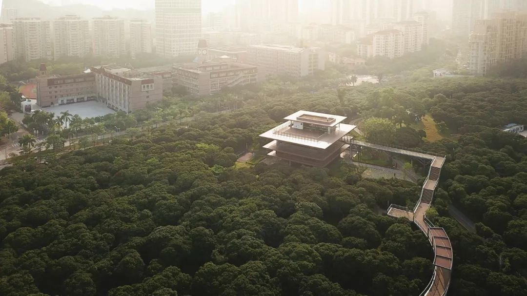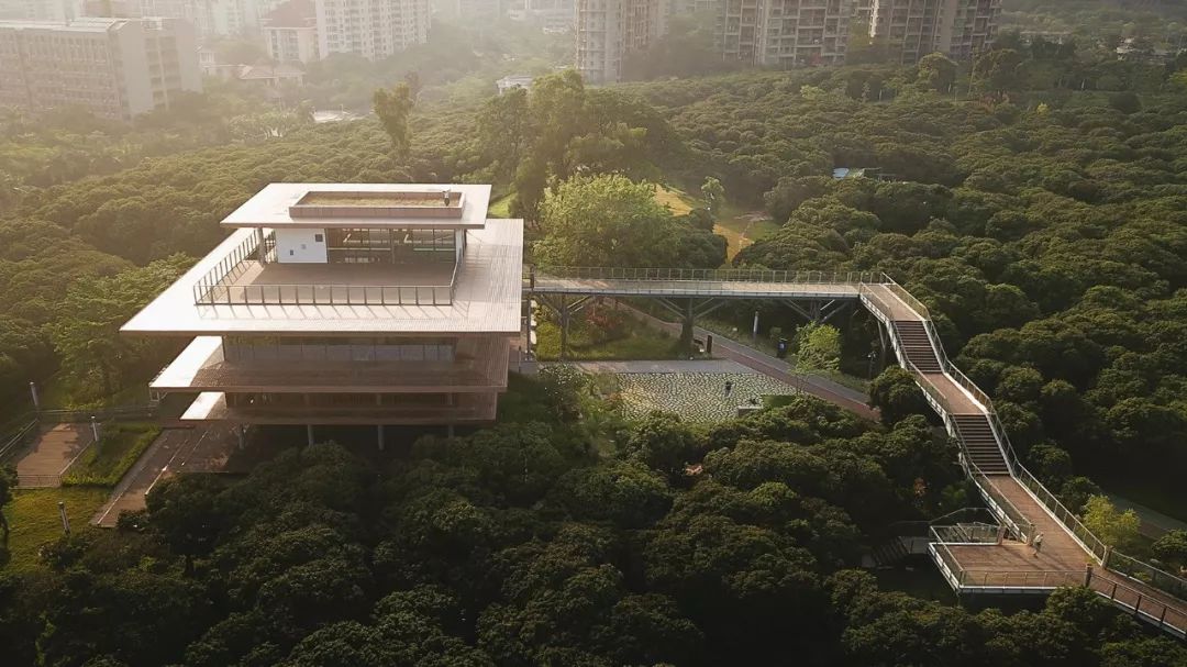 香蜜科学图书馆是一座轻盈的建筑,它与公园中的“树顶步道”形成连接。钢结构和全玻璃立面构成了建筑明亮而通透的基础。巨大的悬臂式结构覆盖以金属涂层,被用于遮挡阳光,其形态参考了当地建筑。公共空间从地面抬升,形成一个全景露台,强调出对于自然环境的体验。