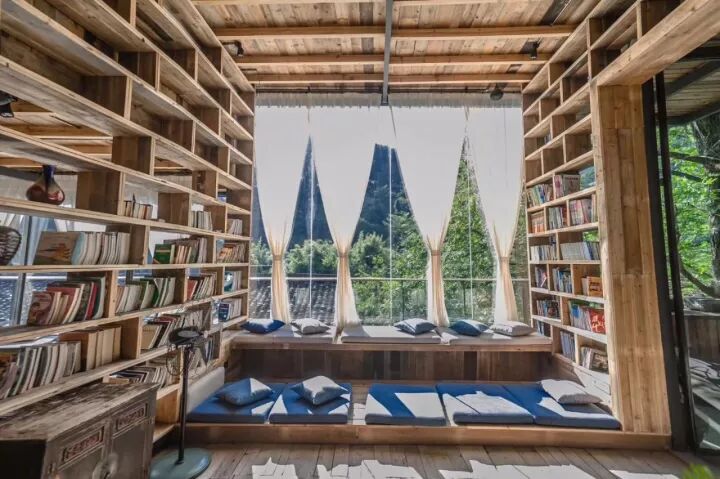 你若恰好读过柳宗元的《永州八记》,春夏山花烂漫,秋冬层林尽染,山谷、溪流、田野、竹海,勾勒出一处诗意栖居的水墨田园。如今放到莫干山,莫干山居图便成了最佳代言。它有着高达两层楼的书墙,让人置身书海,仿佛穿越到巴黎的国家博物馆。
