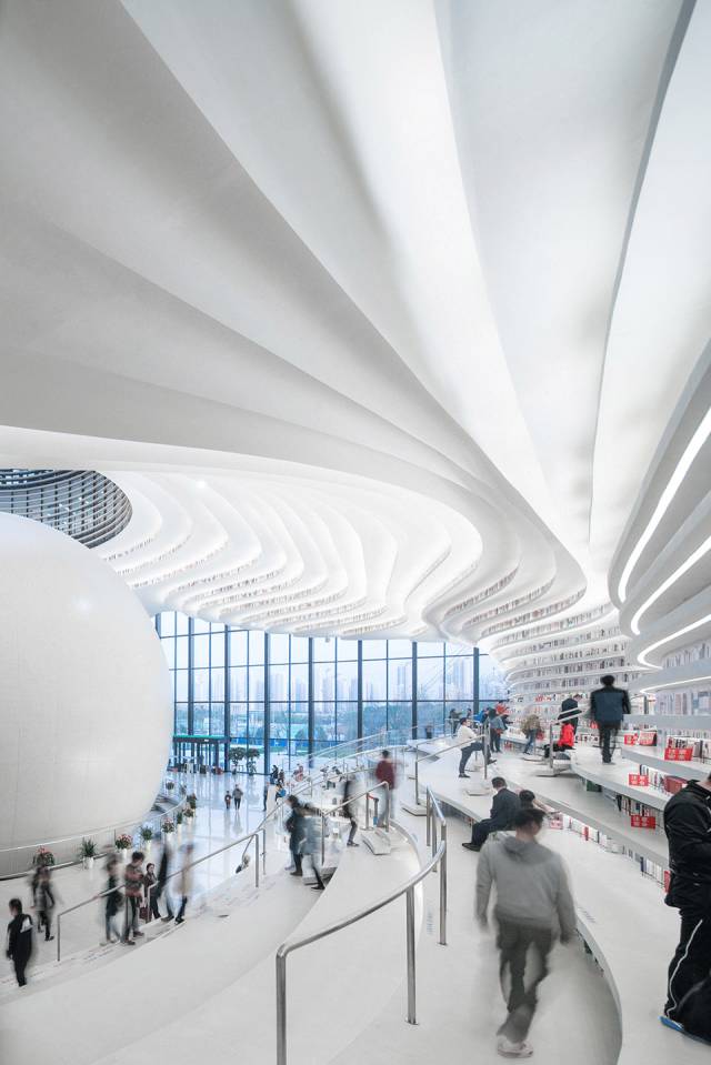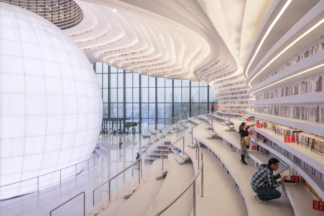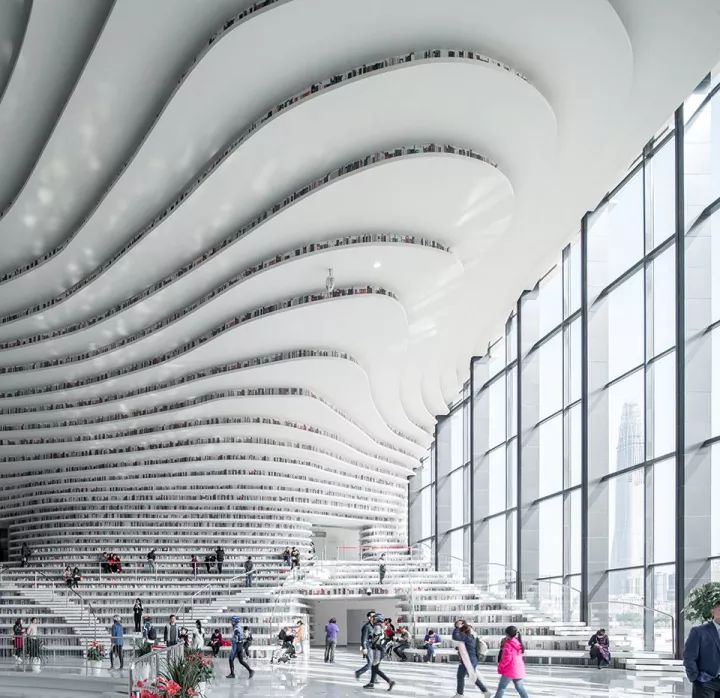 天津滨海新区位于家堡金融区启建滨海文化中心,其中图书馆部分将被打造成为“眼睛”的造型,称作“滨海之眼”。滨海图书馆的中庭被设计成“书山”造型,一层层白色的阶梯呈波浪状铺开,阶梯之上架有同样波浪状的书架,读者可拾级而上,遇到一本喜欢的图书,便可坐在旁边的台阶上阅读。台阶上的书架表露在外部,层层曲线让人好似置身于“海洋”的环境中。