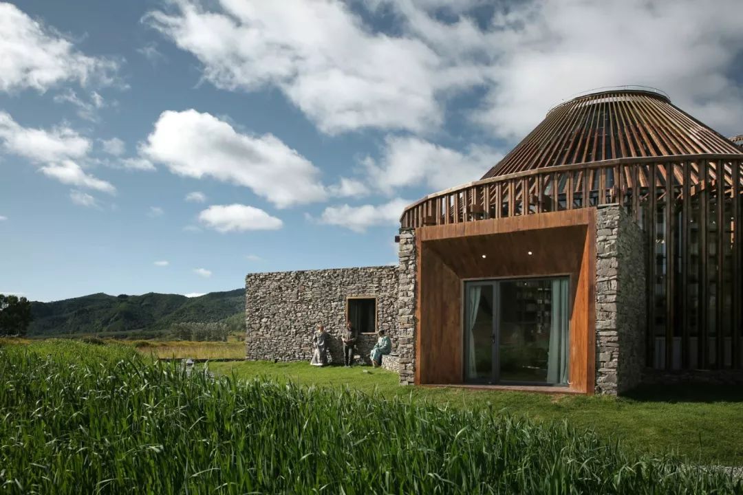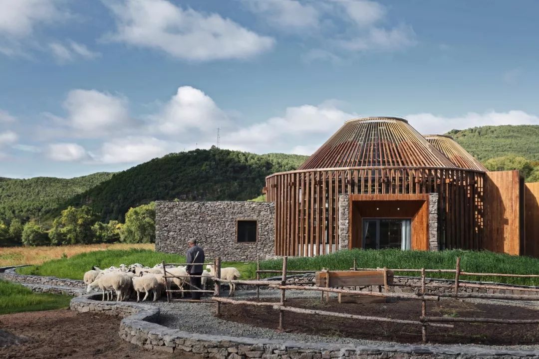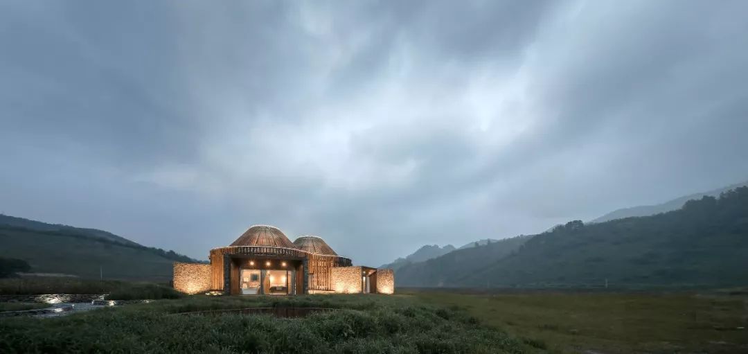 双环圆在中国传统文化里代表吉祥如意,在木兰围场这一设计里,两者结合形了双环蒙古包的建筑图底,结合几个突出体块的几个石头块,拓展建筑室内的功能属性,不同文化之间的相互渗透,形成社区活动中心以及民族大家庭的客厅。