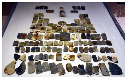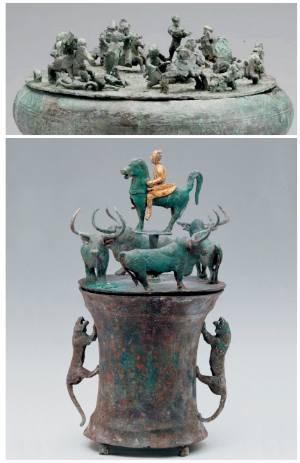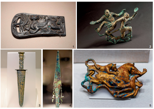柱、蛇和鼓应该都是被祭的对象,蛇在南方少数民族中地位很高,柱代表国家社稷,而铜鼓也是南方少数民族常用的打击乐器。然而,云南地区出土最早的铜鼓并非是单纯的乐器,而是一种较大的炊具,约共四五十人一起食用。因为食物是氏族成员生活的基础,大约就在这个时候,铜鼓被赋予了权力的象征,人们对它有一种恐惧和崇拜心理,类似中原的鼎。尽管后来铜鼓的食器功能被铜釜取代,而成为一种专门的乐器,但人们对它的心理仍然没有变化。石寨山20号墓中,就出土了一件“杀人祭铜鼓贮贝器”;另外在石寨山墓葬还出土了一批直接用来盛放贝币的铜鼓。除了祭祀场面外,石寨山出土的贮贝器还涉及了滇人社会生活的方方面面,比如6号墓出土了一件战争场面的铜贮贝器,该器身高53.9厘米、直径33 厘米,盖上铸22人(现存18人)与5匹马,滇人将领头戴兜鍪,身穿铠甲,腰束佩剑,赤足骑马,作冲杀状。其他的战士有的拿着矛、剑进攻,有的拿着盾牌防御。战败者为辫发之民,应该就是《西南夷列传》的昆明人。他们有的被打倒,有的被刺杀,有的跪地求饶。贮贝器将一场恶战描绘得淋漓尽致。上图/战争场面叠鼓贮贝器,西汉时期滇国青铜器,出土于晋宁石寨山,发现时器身已残,只余一个器盖尚存,反映了滇国将士在战场上与昆明人交战的场景;下图/四牛鎏金骑士铜贮贝器,西汉时期滇国青铜器,晋宁石寨山10号墓出土,为典型的束腰圆筒形的贮贝器还有12号墓出土的一件上仓图像贮贝器盖,盖直径50厘米,中央有一投贝的圆孔,孔周装饰牧猪、羊图,盖周装饰上仓图,人们把临时粮堆的粮食,用头顶筐运送到木仓房中。木仓房顶呈人字形,身呈井字形。比较有特色的还有出土于10号墓的一件鎏金骑士铜贮贝器,器高50厘米,盖径26厘米, 盖中央置一小铜鼓为座,上立一柱,柱端平台上矗立着一位鎏金的骑马执缰骑士。周边环绕着四牛,鼓耳呈虎作攀登状,张开大嘴欲吞噬。除此之外,青铜贮贝器还有表现畜牧活动、纺织活动、赶集(或进贡)活动、行船活动、狩猎活动以及各类图案和动物,生动表现了滇人生活的方方面面。青铜扣饰也是滇人的一种特色器物,因其背上有一个钩状扣而称,也被称为牌饰、饰件。据肖明华《青铜时代滇人的青铜扣饰》一文统计,滇文化墓葬出土的扣饰有658件,时代从春秋到西汉晚期,从形状来看可以分为圆形、长方形和自然形。出土的圆形扣饰超过一半,一般是置放在死者胸腹,应当是系于胸腹的装饰品;长方形和自然形扣饰出土时粘有绢丝和漆皮,可能是一种挂饰或者饰于专门的器具上。石寨山13号墓出土了一件双人舞盘鎏金铜扣饰,高18.5厘米,宽12厘米,背面有矩形齿扣,正面鎏金,有两男子双手各执一圆钹,腰佩长剑,展臂屈腰,双膝弯曲,作跳跃状。两人均赤足,左脚与后跟相抵,脚下共踏一蛇, 蛇张口咬住右边人的右小腿。值得一提的是,这样的钹舞,在山东沂南画像墓和四川画像砖也曾出现。此外,还有6号墓出土的一件四人缚牛铜扣饰,高9.6厘米,宽16厘米,表现四个人将一头牛绑在柱子上即将宰杀。除了这类表现社会生活的扣饰外,也有不少表示动物图案的,最具特色的是一种动物搏斗扣饰,比如71号墓出土了一件鎏金二豹噬猪铜扣饰,长16厘米,宽10厘米。其中一豹扑于猪背,后爪抓住猪后腿,前爪抓住猪肩腹, 张口咬住猪背,另一豹钻到猪腹下,抓咬猪腹。造型生动,栩栩如生。还有13号墓出土的一件长方形狐边铜扣饰,高5.7厘米,宽9.2厘米,正面镶嵌白绿色玛瑙管珠及绿松石,边缘一周雕刻首尾相接的狐狸,也非常有特色。石寨山古墓群经过五次发掘,清理战国至汉代的古墓86座,出土文物近5000件,有青铜器、金器、银器等。其中的青铜器铸造精良,表现了滇人生活的方方面面,具有浓厚的地方民族特色 :1 翼虎纹银带扣 ;2 鎏金二人盘舞铜扣饰 ; 3 猎首纹铜剑 ; 4 吊人铜矛 ; 5 鎏金二豹噬猪铜扣饰除了贮贝器和扣饰外,其他青铜器虽然并非滇人独有的种类,但也具有自己的风格特色。比如兵器就比较喜欢以人物或动物装饰。可惜的是,滇国人并没有自己的文字。在石寨山13号墓出土了一块刻有图形符号的铜片,似乎蕴藏着一些信息,有学者认为这可能是古滇国的图形文字,但这样的符号发现太少,也难以作更多的解读。不过,目前石寨山的发掘尚未结束,神秘的古滇国还有不少秘密,等待我们进一步去探寻。本文经“国家人文历史”(微信ID:gjrwls)授权转载