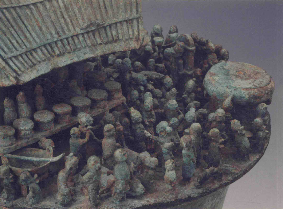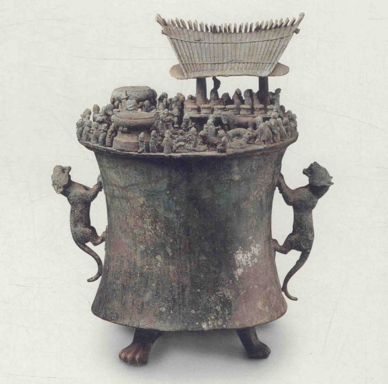 在老虎与房屋之间有鼓架,悬挂着一面鼓和一件錞于,1人在敲打。房屋对面是村社中心,有一个柱子,柱子上盘有两条蛇,一条蛇吞入一个人的下半身,上半身仍在蛇口外。柱子旁边的木牌上还绑缚一人,另有一个戴枷锁的人,都应当是祭品。还有一些人抱着鱼、头顶箩筐、坐着交谈、骑马赶来, 应当都是参与祭祀的人,此外还有身穿异族服装的外来人。在要杀的人牲旁边有两个与人同高的巨大铜鼓,在器盖两边,也各有一个大铜鼓。![]()