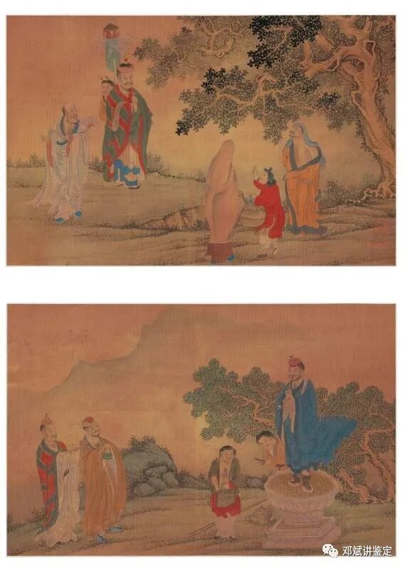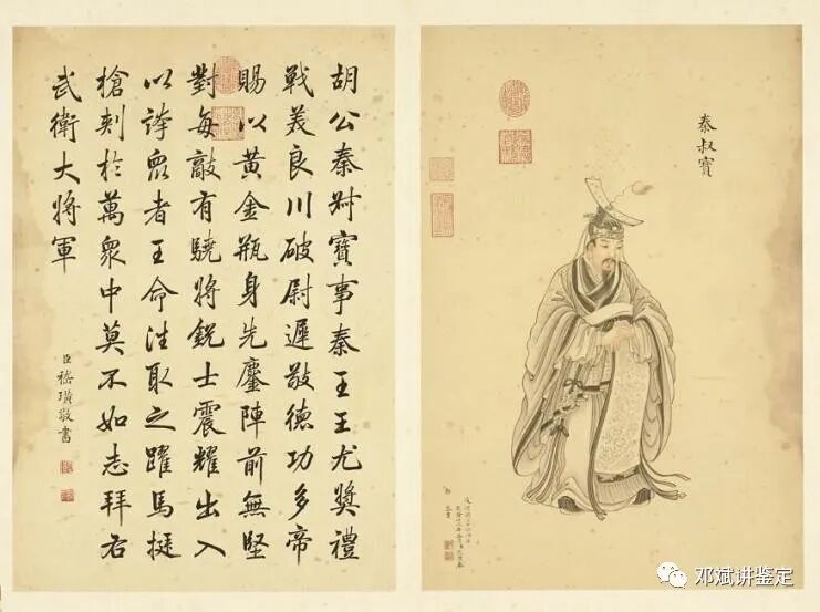 宫廷绘画亦如此,尤为重。沈源绘《墨妙珠林》(酉)册页,就是这样的教育背景和文化价值。《墨妙珠林》右幅为设色人物画、左幅行楷书,共二十四册页,款:凌烟阁二十四功臣,乾隆十二年五月,(臣)沈源奉敕恭画。钤印二,臣沈源、恭画。