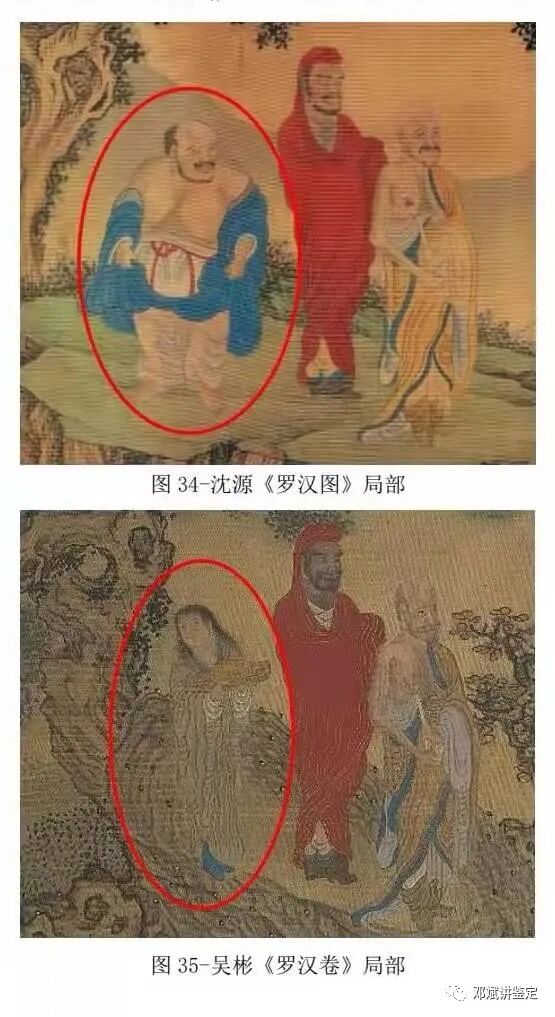 将沈源的《罗汉图》与母本台北故宫博物院收藏的吴彬《罗汉卷》详细比对,发现为《罗汉图》传移摹写,精准到位,某些局部佛像组合可谓是精细“复制”母本(如图26、27、28、29、30、31)。