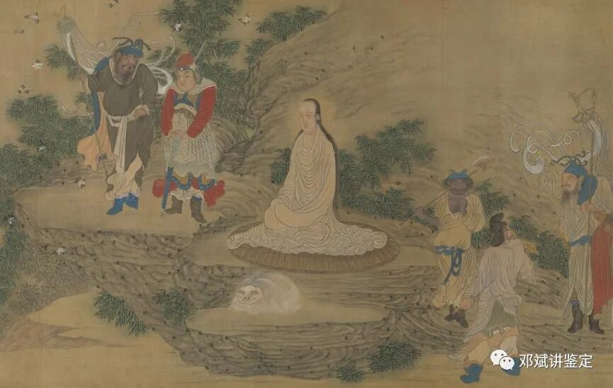 沈源《十八罗汉图》又名《沈源演教图卷》,绢本,纵28厘米,横624 厘米,乾隆八年(1743年)闰月作。此画的人物形象及姿态也采用了《李公麟十八罗汉册》中部分造型,意境幽远,生动自然,风格上却显露出明代文人画之气息。