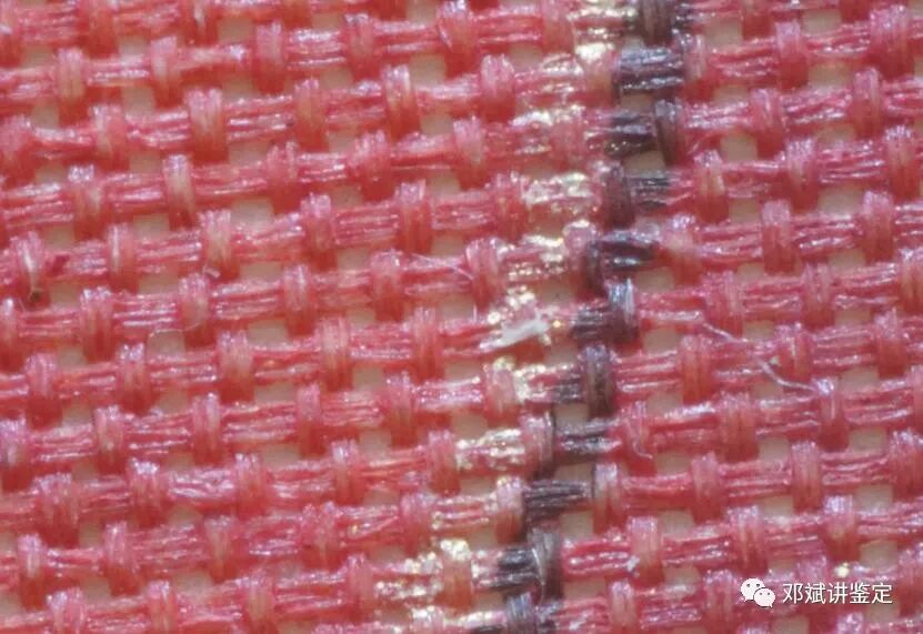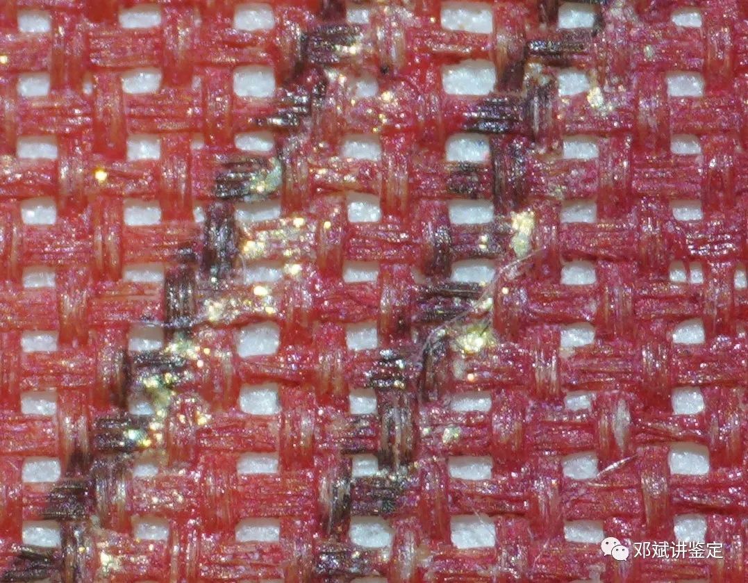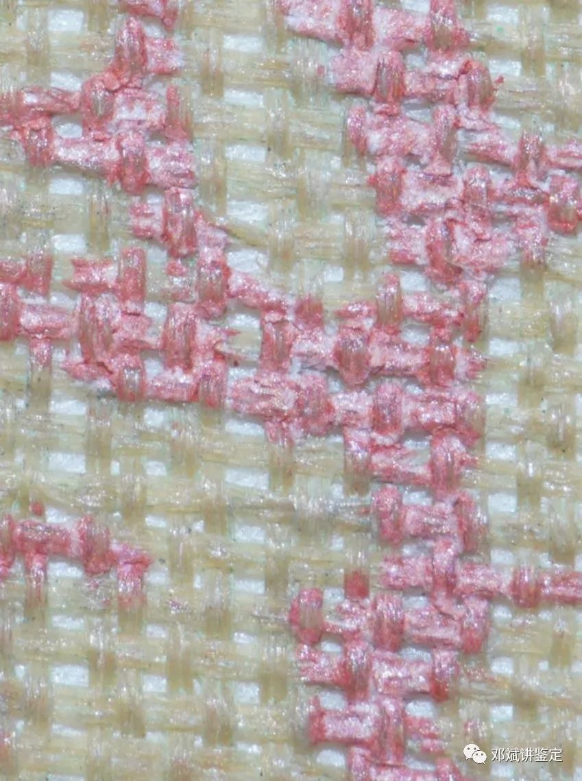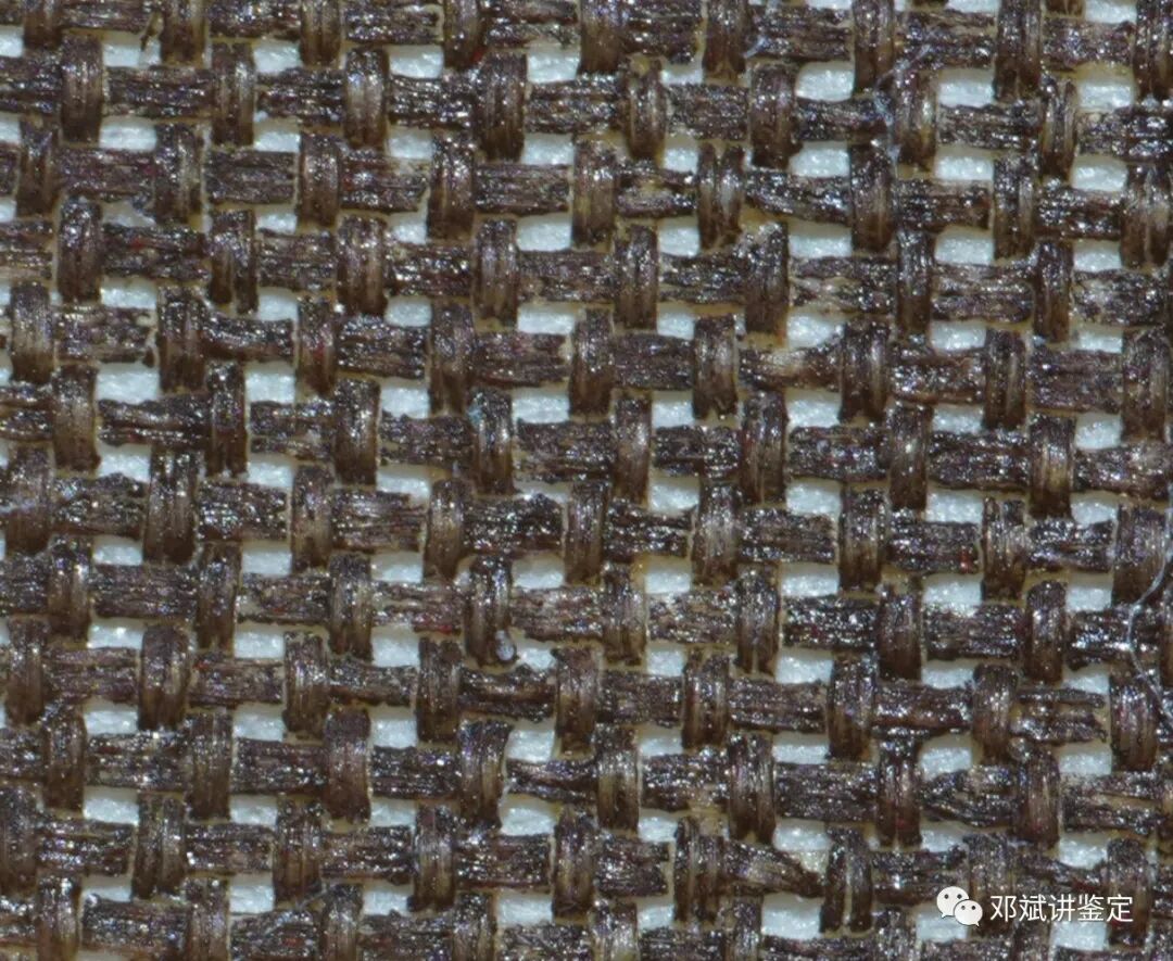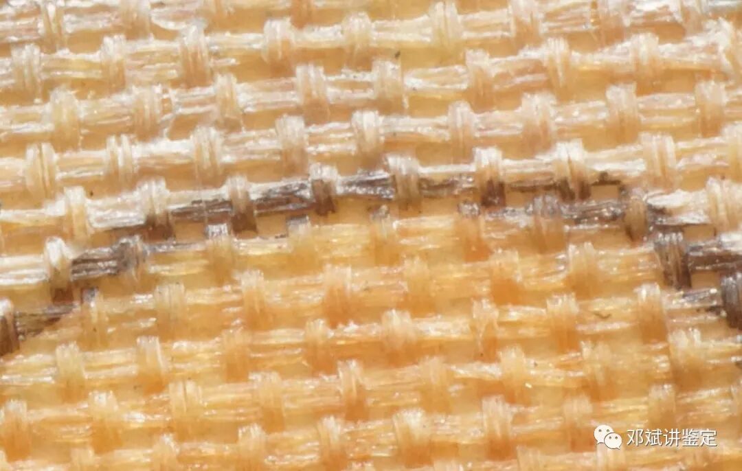 双丝绢,双丝是指经线由两根丝为一组丝,每组丝之间约有一根丝的空隙,每组丝不是并行的,是由一根纬线交叉隔开的,纬线是单丝,交织成为双丝绢。使用书画检验仪检测沈源《罗汉图》绢本,双丝绢的细节结构清晰可见。(图44)