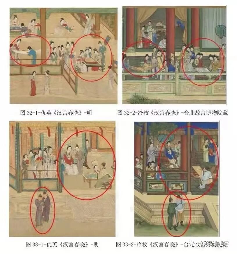 如中国十大书画名作之《韩熙载夜宴图》其原作为五代南唐时的顾宏中所绘,现存的画卷实为宋代的佚名摹本。又如台北故宫博物院不仅收藏了明代仇英的《汉宫春晓图》,也收藏了清代冷枚的摹仿《汉宫春晓图》作品(图32、33)。