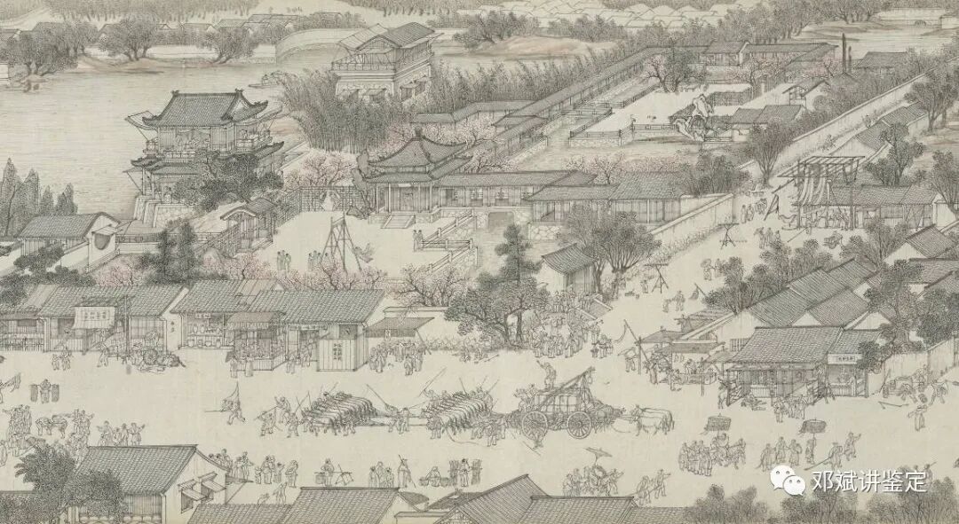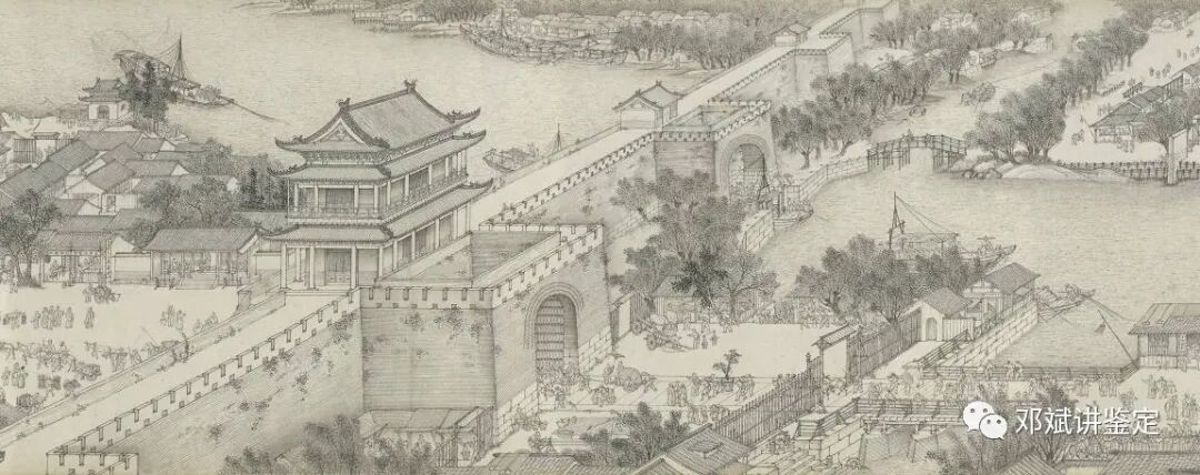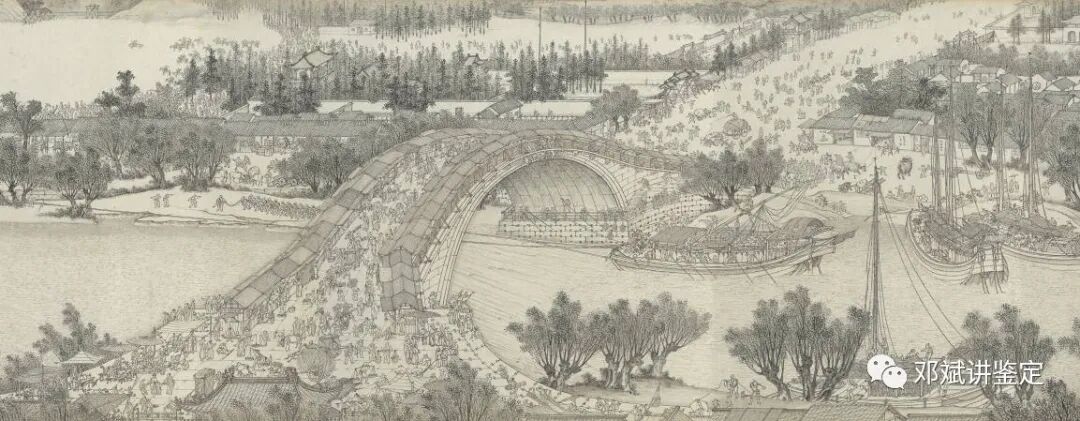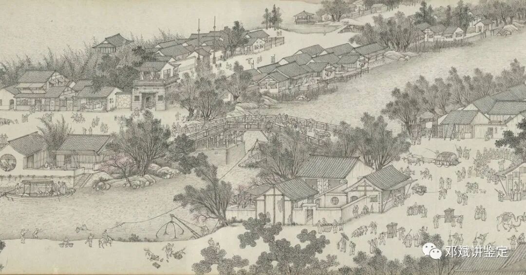 在画法上,借鉴了当时传入宫廷的西洋“线法画”,采用西洋绘画中的焦点透视法,与其他版本相比,沈源版的桥梁、屋宇等景物表现得更三维更立体。