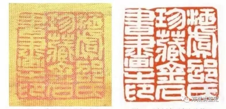 将沈源《罗汉图》(轴三下)上邵松年的“海虞邵氏珍藏金石书画之印”(图47)与《中国书画家印鉴款识》(文物出版社出版)第632页上邵松年的“海虞邵氏珍藏金石书画之印”印文样本(图48)进行比对检验,如图:
