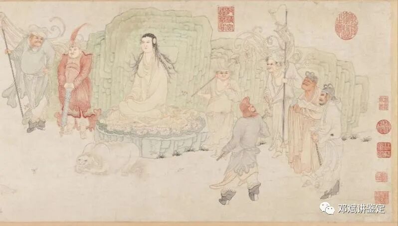 沈源《罗汉图》,共有八枚鉴藏印文,邵松年的“海虞邵氏珍藏金石书画之印”四枚,李恩庆的“李氏爱吾庐收藏书画记”四枚。