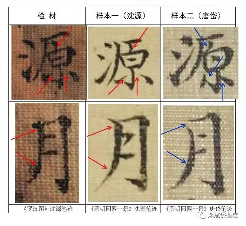 比对检验发现,检材(1734年)与样本(1744年)之间时间相隔10年,宏观上,都是小楷字体,书写水平相当;中观上有“甲、月、沈、源”等四个相同字;微观上,检材的“源”字中“白”字部起笔位置、“小”字部的左点运笔方向为提笔;“月”字的撇笔的起笔位置及转折笔的位置和运笔力度等笔迹特征,与样本一(沈源的落款字迹)表现相同,与样本二(唐岱的落款字迹)表现差异。