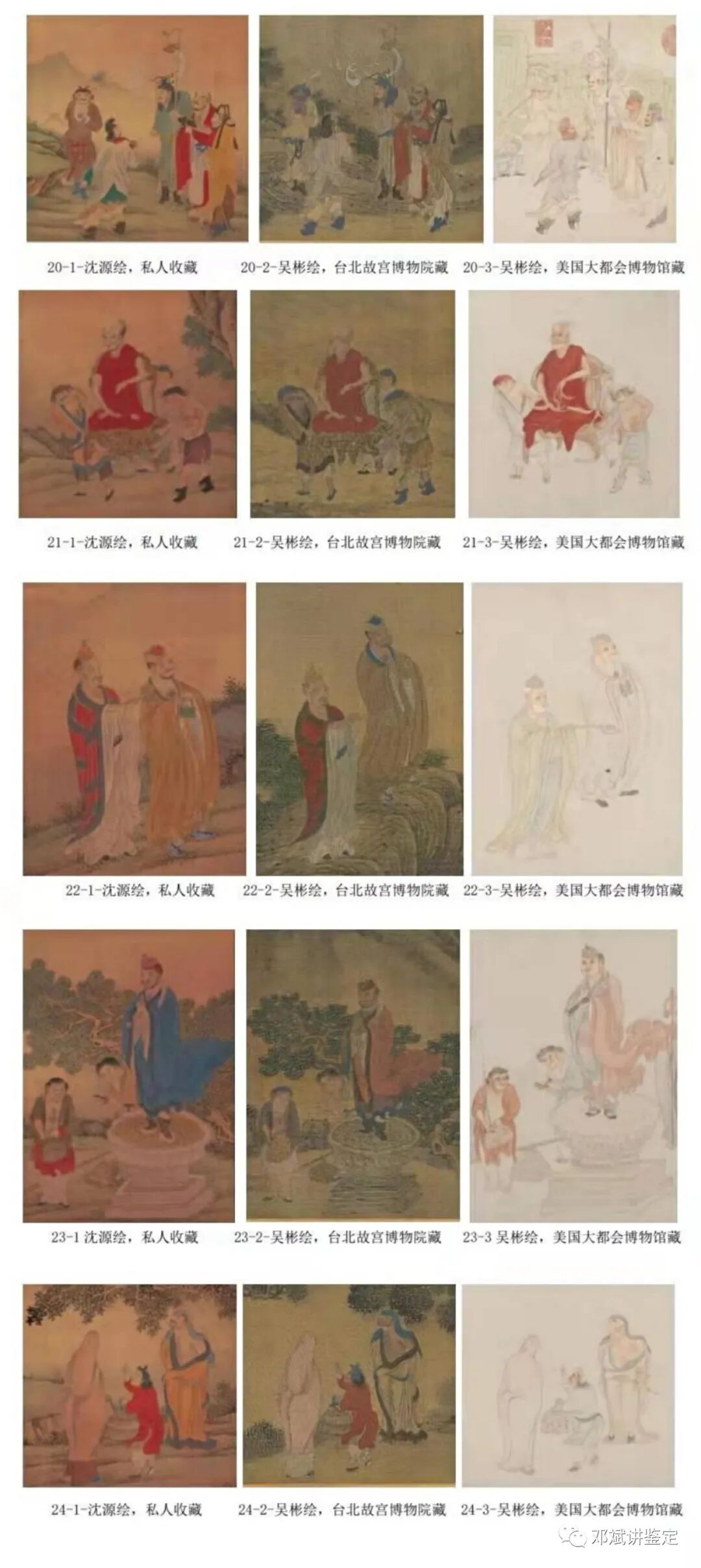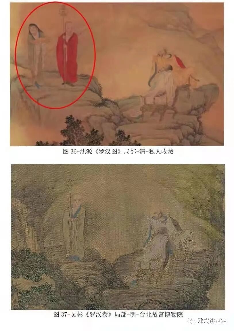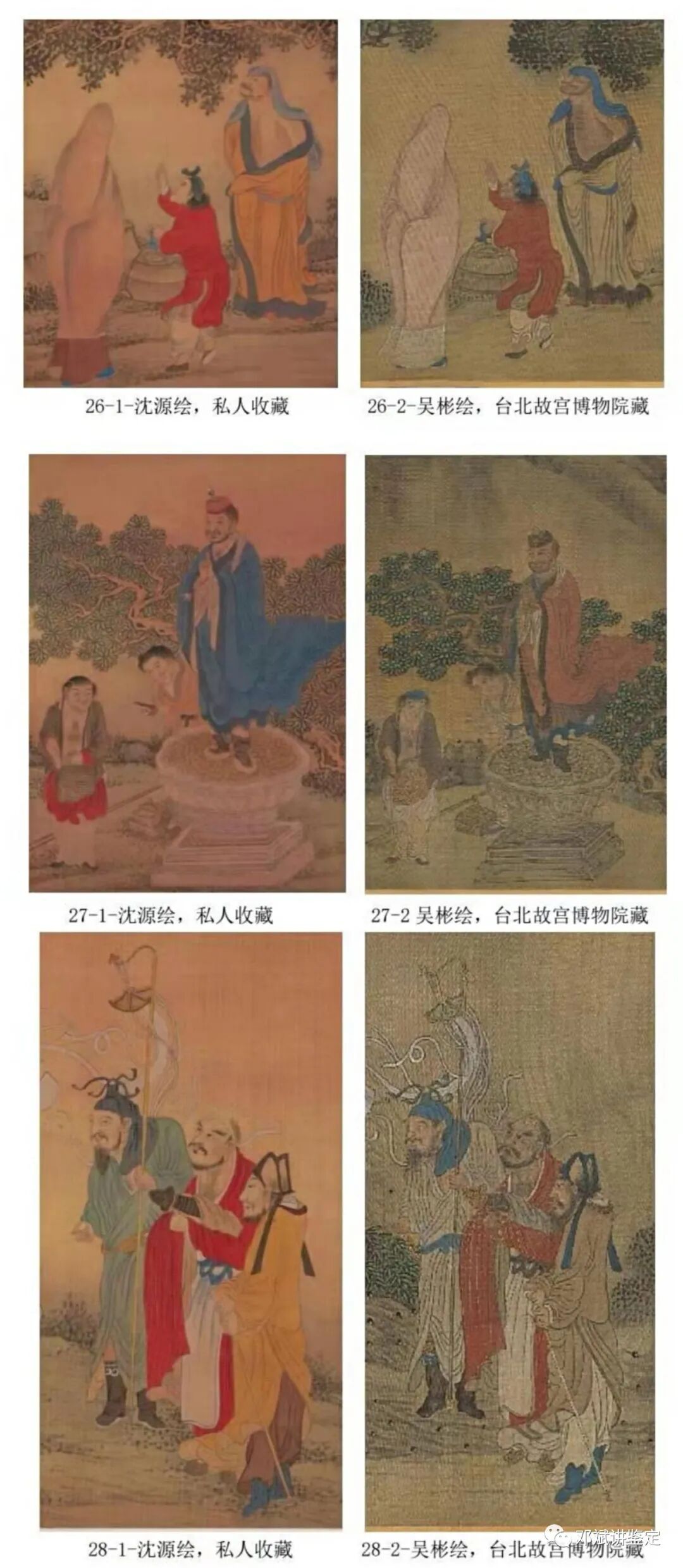比对可见,台北故宫博物院收藏的《罗汉卷》和美国大都会艺术博物馆收藏的《十八应真图》是吴彬同一题材内容的不同版本。沈源《罗汉图》是以台北故宫博物院收藏的吴彬《罗汉卷》为母本。