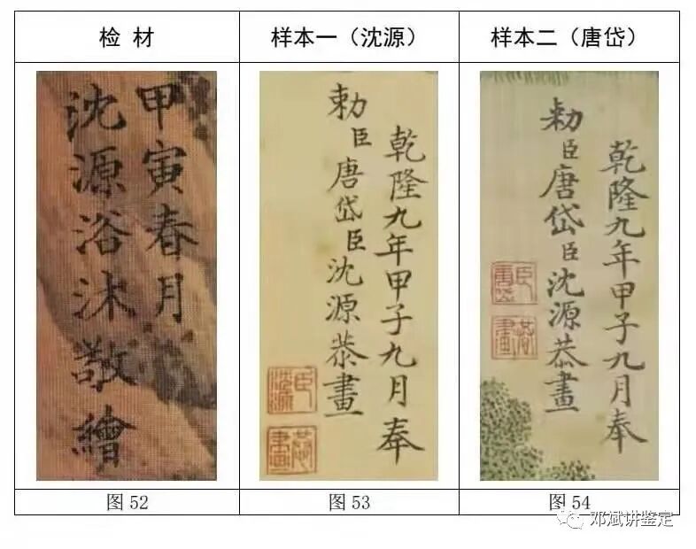 沈源《罗汉图》为绢本,款识笔迹为“甲寅春月 沈源沐浴敬绘”,小楷字迹,甲寅的时间为1734年。以下称为检材(图52)。