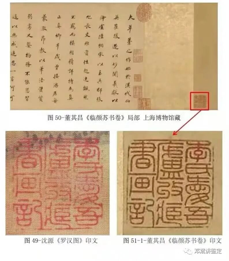 沈源的《罗汉图》轴二上钤有李恩庆的“李氏爱吾庐收藏书画记”印章印文(图49),上海博物馆馆藏的董其昌《临颜苏书卷》(图50),其卷首右下角钤有“李氏爱吾庐收藏书画记”印章印文 (图51-1),将两枚印章印文进行比对检验。