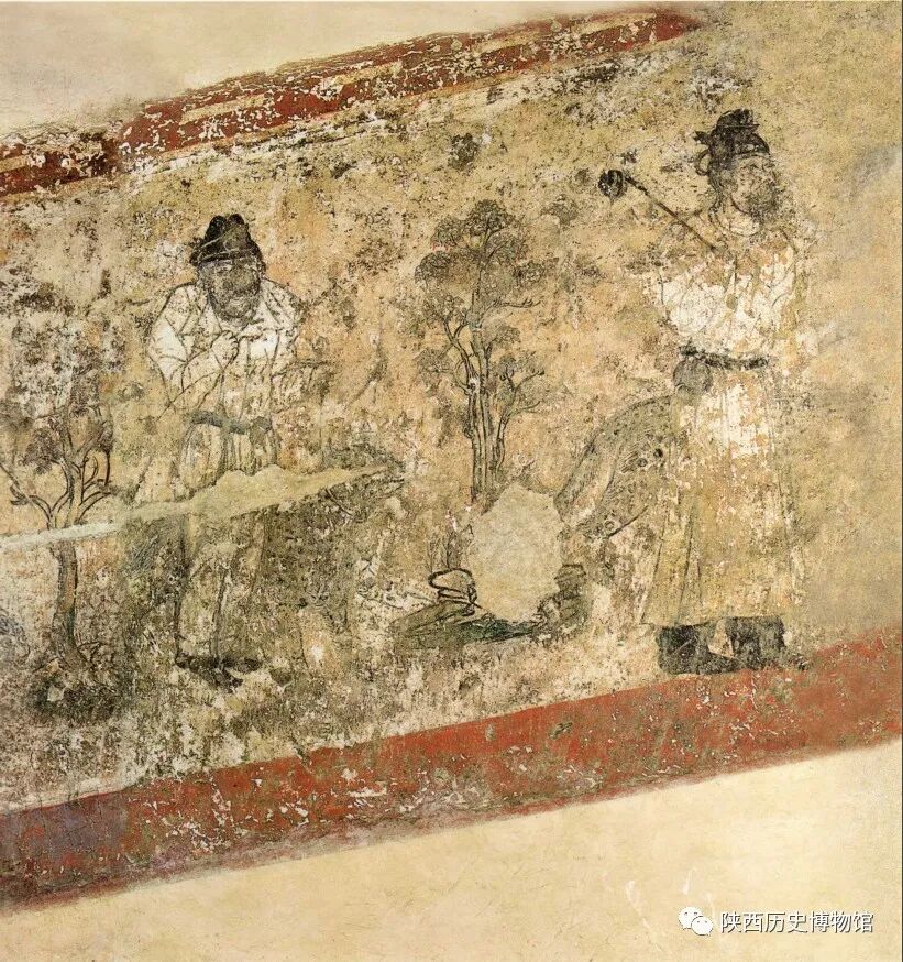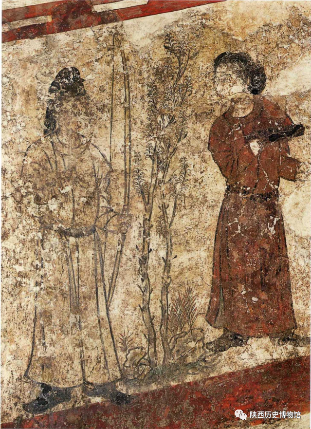 懿德太子墓壁画第二过洞东壁以小龛为界,南侧绘架鹰驯鹞图,北侧绘此图。图中两名男侍,中间隔以两棵树,北边一人身着淡黄色圆领袍衫、左手持弓弦,右手举至胸前。南边一人身穿褐色圆领袍衫,右手托一长方形盘子,正回首与持弓者交谈。盘中可能盛放的是驯养动物的饲食。