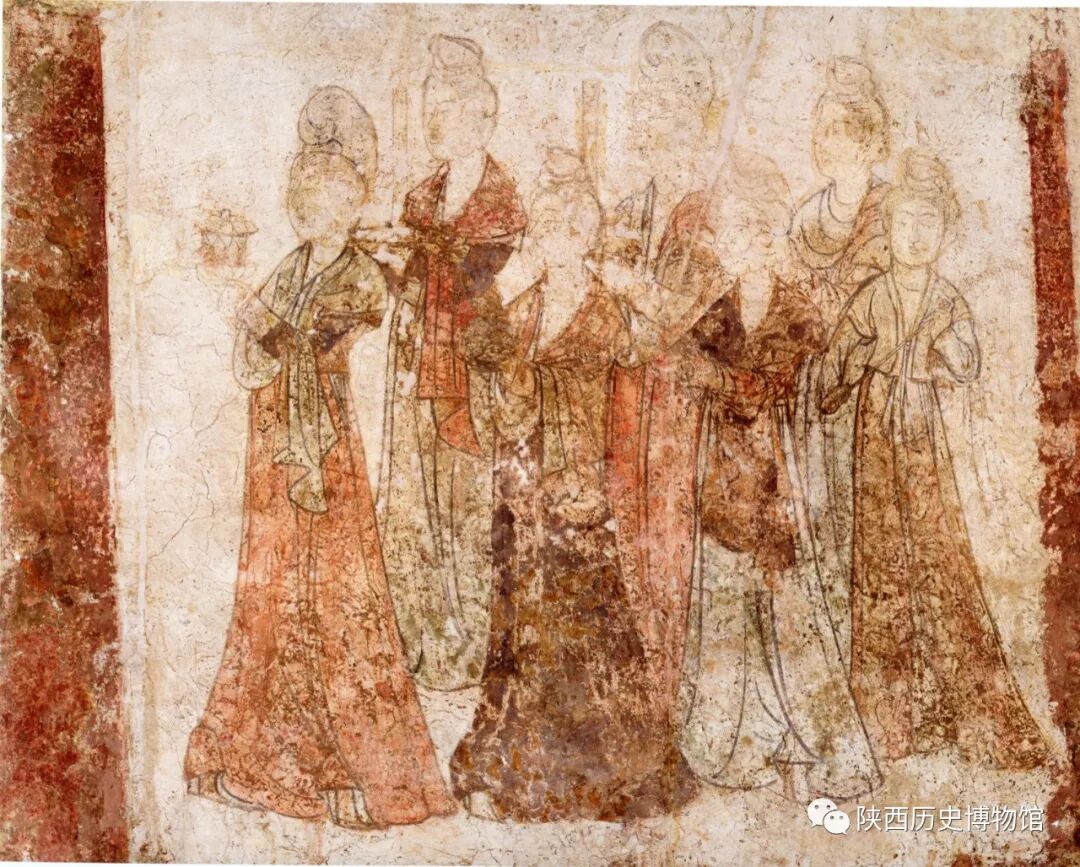 前室西壁在表示内宫的影作木构下,以中央红柱为界,南北铺分别绘制一幅七人的宫女图,两组宫女面向中央红柱,作向前行走状。人物排列呈三角形,前后错落有致,通过服装颜色的明显区别和人物表情、手中持物的变化,避免了东壁两组、西壁两组总共四幅宫女图在构图相同的情况下容易产生的呆板和雷同。唐代人物画在中国美术史上占据重要地位,尤以仕女画著名。与前代主要表现列女孝妇的概念化人物形象不同,注重表现女性的自然美以及雍容、典雅、娴静的内在气韵,这在墓葬壁画的宫女图中尤其明显,也最令人称道。