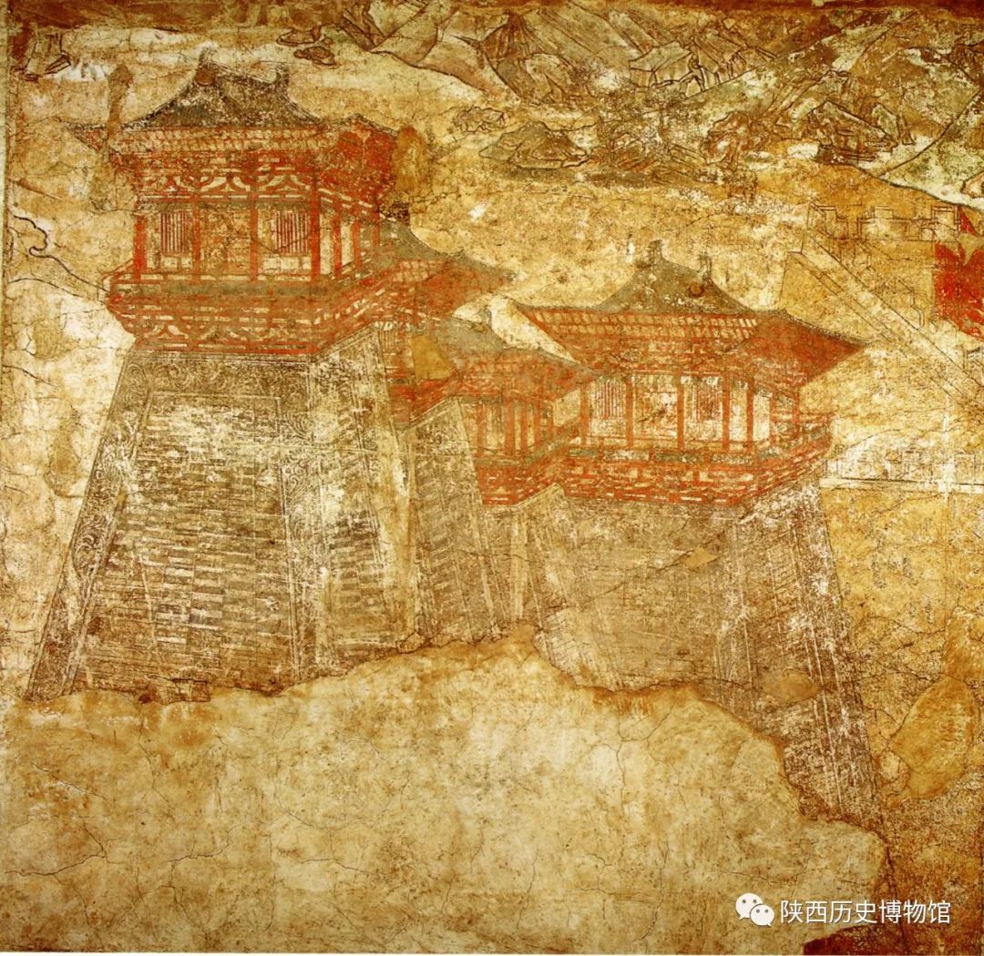 阙楼在唐墓壁画中不惟此例,但都是单阙或双阙,惟有懿德太子墓中的阙楼图为三重子母阙即三出阙。从画面来看,它由方形墩台、平座、屋身、庑殿形屋顶四部分组成,高约20余米,斗棋及贴金的装饰应是仿实物绘制。阙楼图绘于第一过洞南壁的建筑图前,应是宫殿门前的标志性建筑。两唐书中有关宫阙的记载很多,从这些记载可知,阙是皇宫中重要的建筑,对叛臣、敌人的处罚有时在阙前进行,官吏在进入宫殿前也常常在此反省待罪,阙甚至成为皇宫的象征。