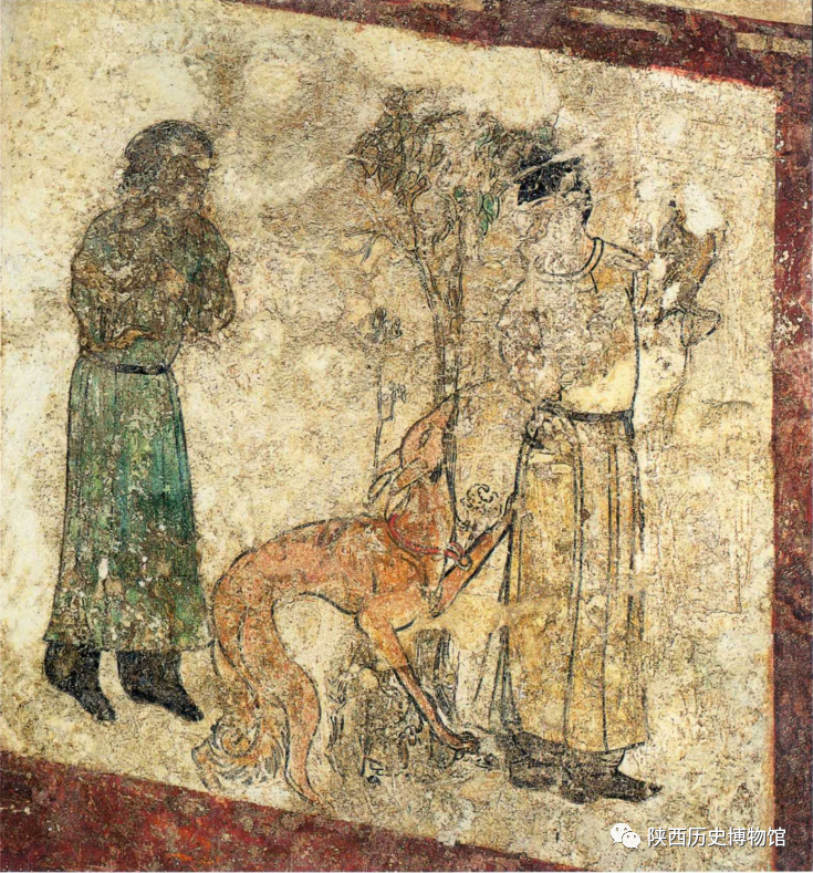此图绘于小龛北侧,图中两人,一人左臂架鹞,正在驯鹞,同时回首,似正吆喝身后的猎狗。狗为棕黄色,长腿细腰,脖子上系有项圈,左前爪已经抓到驯鹞者的身上,正抬头与回望的驯鹞者呼应,后面跟随一名身着绿衣的侍者。鹞是一种体型小的短翅鹰属飞禽,人们多用它来猎取生活在林木繁茂地区的小鸟,被誉为森林中的猎手。图中的犬可能就是唐人称作波斯犬的动物。它身材高大,迅猛残忍,是捕猎尤其是捕捉狐狸的好手,至今关中地区仍然可以见到这种形状的犬,俗称细狗。