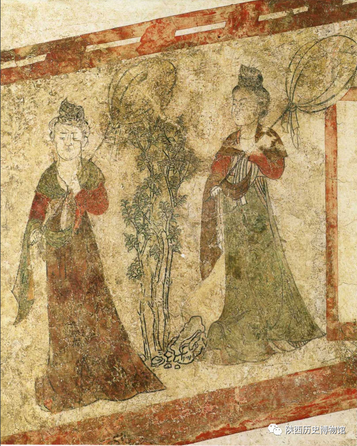 第三过洞东、西壁中间各有一小龛,其南为内侍图,其北为执扇宫女图。似乎以第三过洞小龛作为壁画表现内容的分界线,由此便进人东宫内廷。图中两宫女,南面一位面向内,北面一位为直视的正面。一位面容年轻,纯洁娴静,一位面容稍大,表情略带寂寥和忧伤。两位宫女手中各持一圆形长柄器具,一般认为是丝绸包裹着的团扇。《唐六典》宫官尚寝局条有“司舆二人,正六品,掌舆辇伞扇羽仪之事”。因此,这两位宫女很有可能是宫官司舆。也有学者认为两位宫女手持之物是捕蝶或捕鸟器。