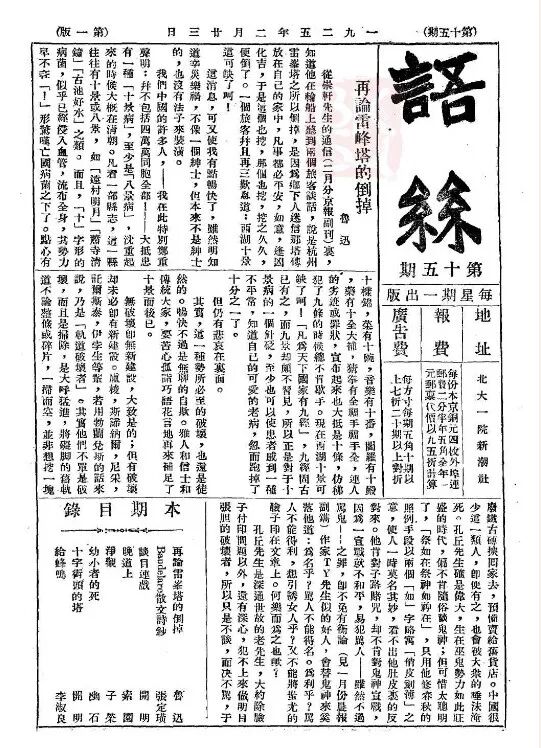▲鲁迅《再论雷峰塔的倒掉》,载《语丝》周刊1925年第15期