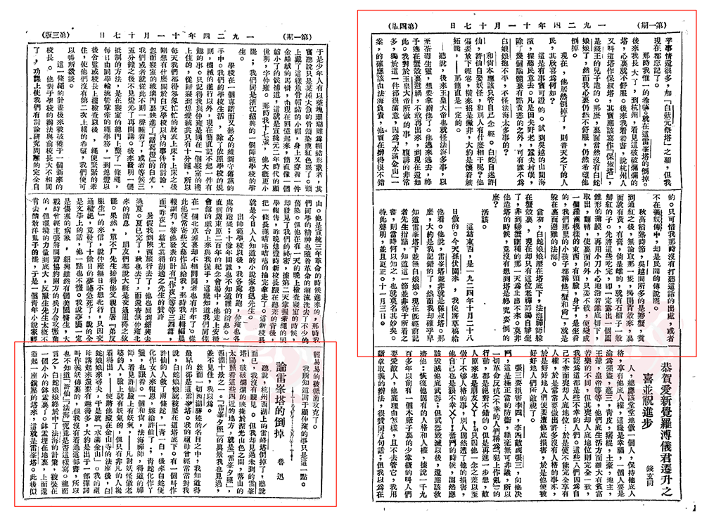 显然,雷峰塔的信息再次被隐匿了,写作该文的记录也全然未见。但据该文初刊时附记中所言“这篇东西,是一九二四年十月二十八日做的”可知,《论雷峰塔的倒掉》确于该日所写。由日记披露的该日行踪可以推知,鲁迅不太可能于白天写作,而只能在晚上送别宋子佩之后。如果说雷峰塔倒掉之后频繁访问鲁迅的孙伏园、孙寿裳等早已告诉了他倒掉的事实及其反响,那么顾颉刚10月12日和宋子佩10月28日的来访,则极可能成为鲁迅挥笔写就《论雷峰塔的倒掉》的直接动因。因为顾颉刚于10月12日到访,次日,其友人俞平伯来函之一部分就刊载于《北京大学日刊》。可想而知,顾颉刚拜访鲁迅时应已收到那封信,而与鲁迅聊及同乡俞平伯眼中的雷峰塔倒掉事件,则极有可能。10月28日晚上拜访鲁迅的宋子佩是浙江绍兴人,是鲁迅在浙江两级师范学堂任教时的学生,后来又成为鲁迅在绍兴府中学堂的同事。鲁迅写作该文时,宋子佩是北京图书馆职员,兼任《华北日报》编辑,对新闻时事照样有着敏锐的感知。他在拜访鲁迅时聊起雷峰塔的倒掉及其后众说纷纭的反应,或也是极有可能之事。