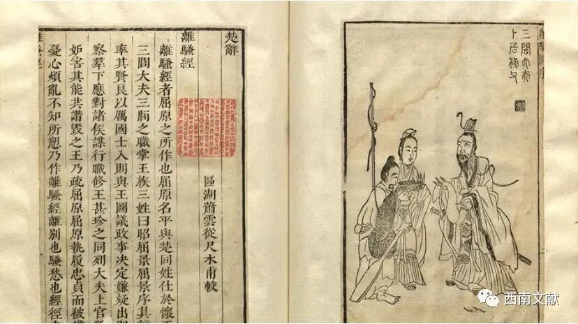 尤其需要提及的是,明末清初的人物画家陈洪绶(号老莲)对于书籍插图倾注心血,贡献奇伟。如,《西厢记》、《楚辞·九歌》插图及《博古叶子》、《水浒叶子》、《归去来辞》等,均由他构思稿本,勾勒图形后,交由当时的能工巧匠上板摩刻。例如,《西厢记》由项南洲刻,用线圆润流畅,描绘了张生、崔莺莺、红娘等鲜活的艺术形象;《九歌图》由黄镌中刻,线条方圆互用,大诗人渊淳岳峙忧国忧民的丰釆跃然纸上;《博古叶子》由黄子立刻,爱憎分明地塑造了一些风貌、品行各异的高人逸士。《水浒叶子》则以过人的胆识讴歌了农民起义英雄群像。画家设计匠心超凡,刻手技艺精工传神,相得益彰。插图把握准确,人物鲜明,章法奇妙,线条遒劲,增添了文学作品的无穷魅力。如果说,屈原、陶渊明、王实甫等大家,妙笔生花,字字珠巩;那么,老莲则镂月裁云,满纸霞蔚。此类图书称得上是图文并茂的典范。清代张庚在《国朝画征录》中高度评价老莲的人物画:“躯干伟岸,衣纹清圆细劲,兼有公麟、子昂之妙,设色学吴生法,其力量气局,超拔磊落,在仇(英)、唐(寅)之上,盖三百年无此笔墨也。”如此丹青大家钟情于插图艺术,何等难能可贵!
