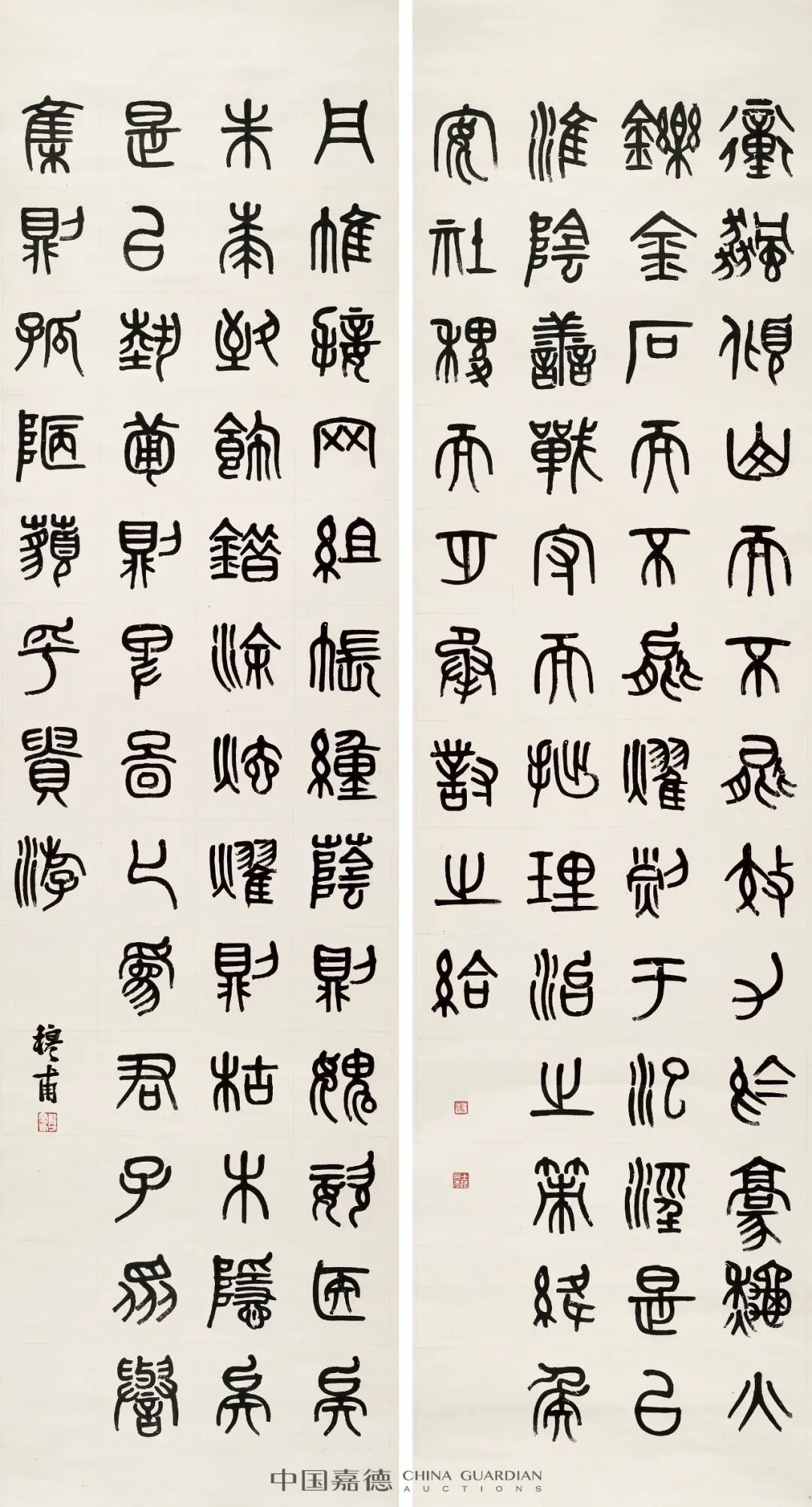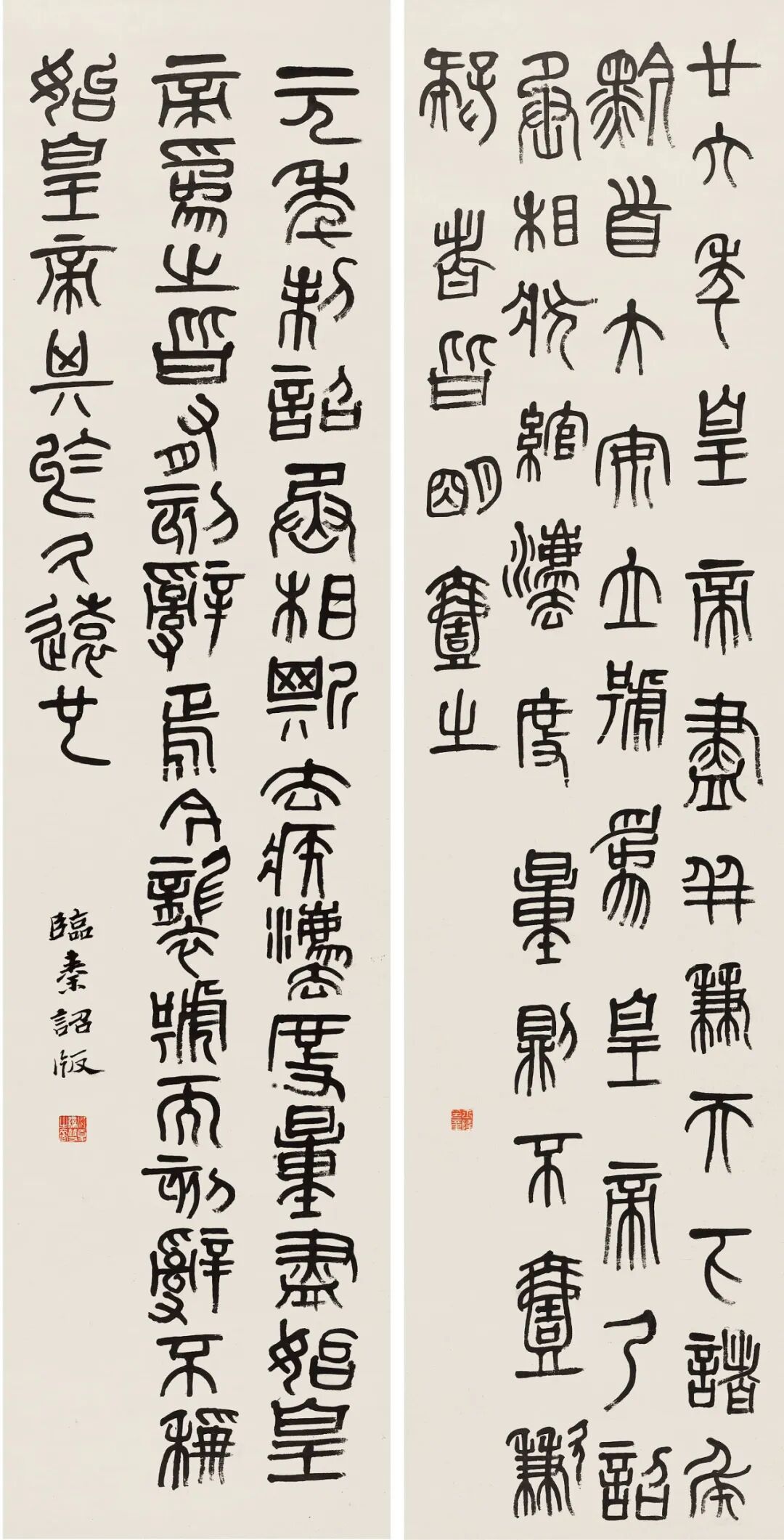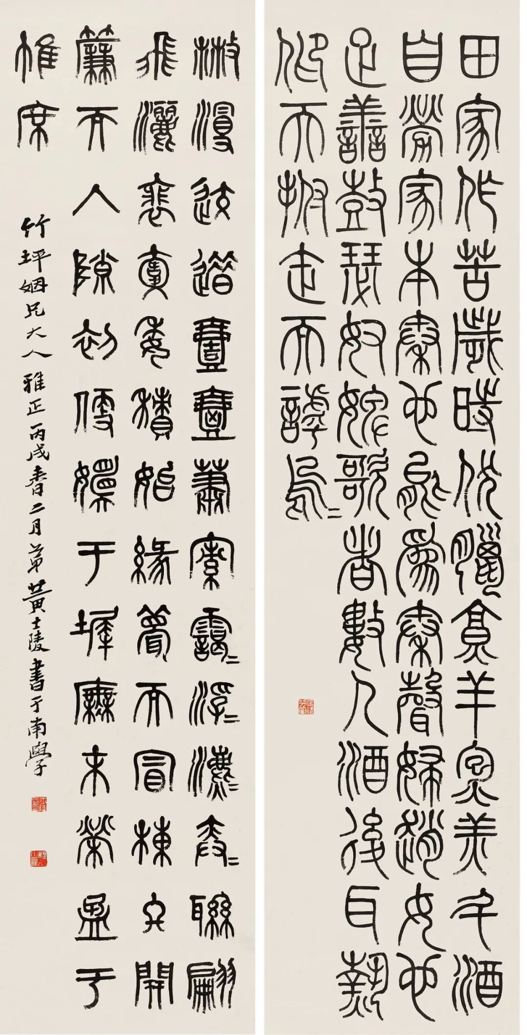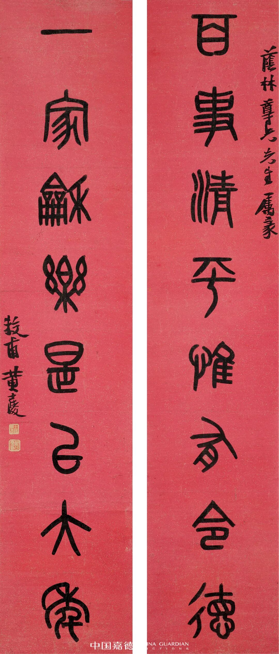 黄士陵篆书晋葛洪《抱朴子》二屏以朱丝栏为界格,整篇九十六字充盈着大篆书风,庄重整饬中独具中正庙堂气息,笔法中锋圆润却又富于轻重、粗细、曲直的变化,源于先秦钟鼎遒劲浑朴的韵味在黄士陵此书中表达的淋漓尽至,此二屏当是黄士陵成熟书风的精品代表。