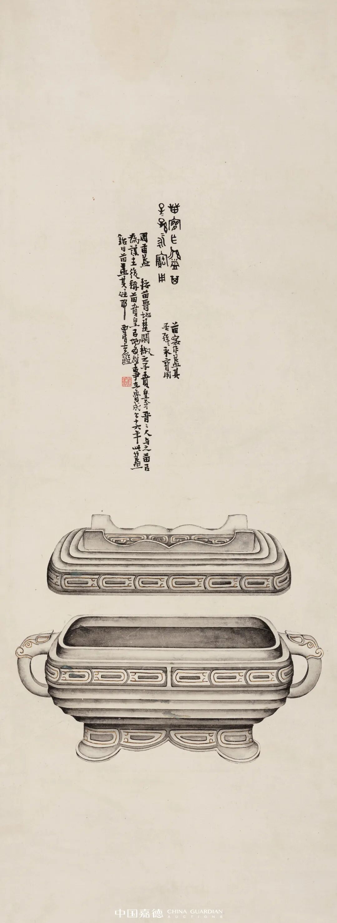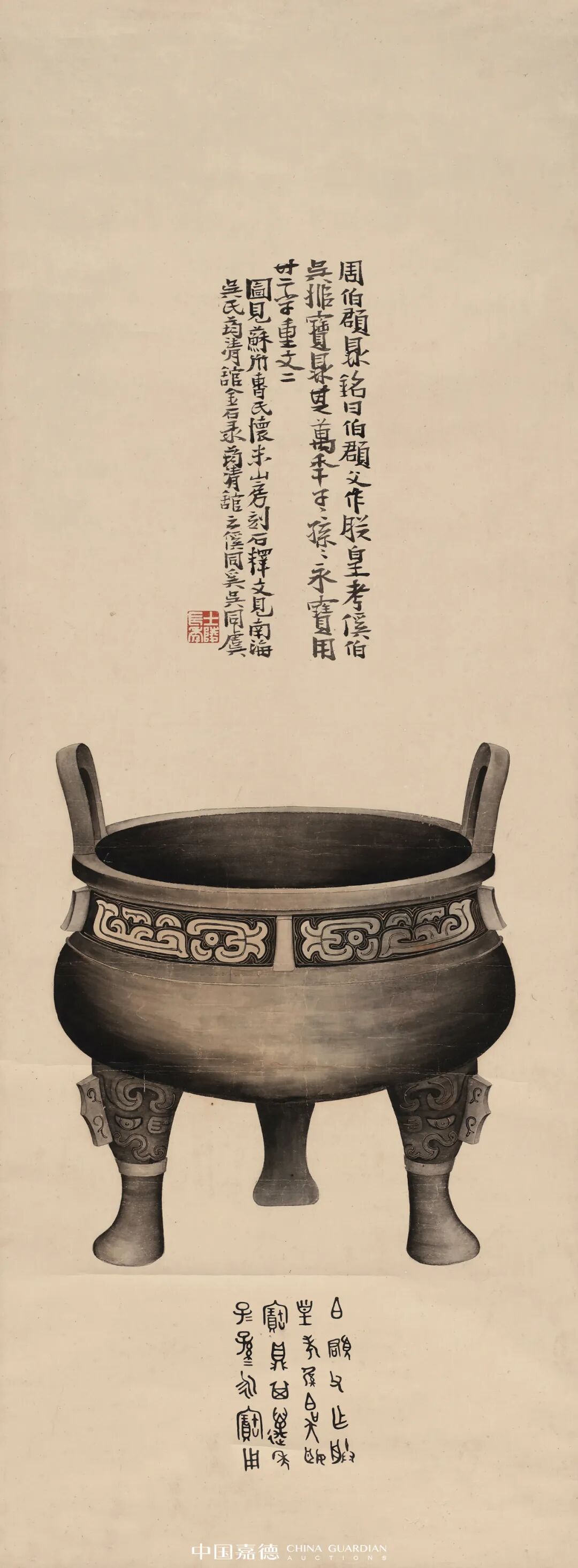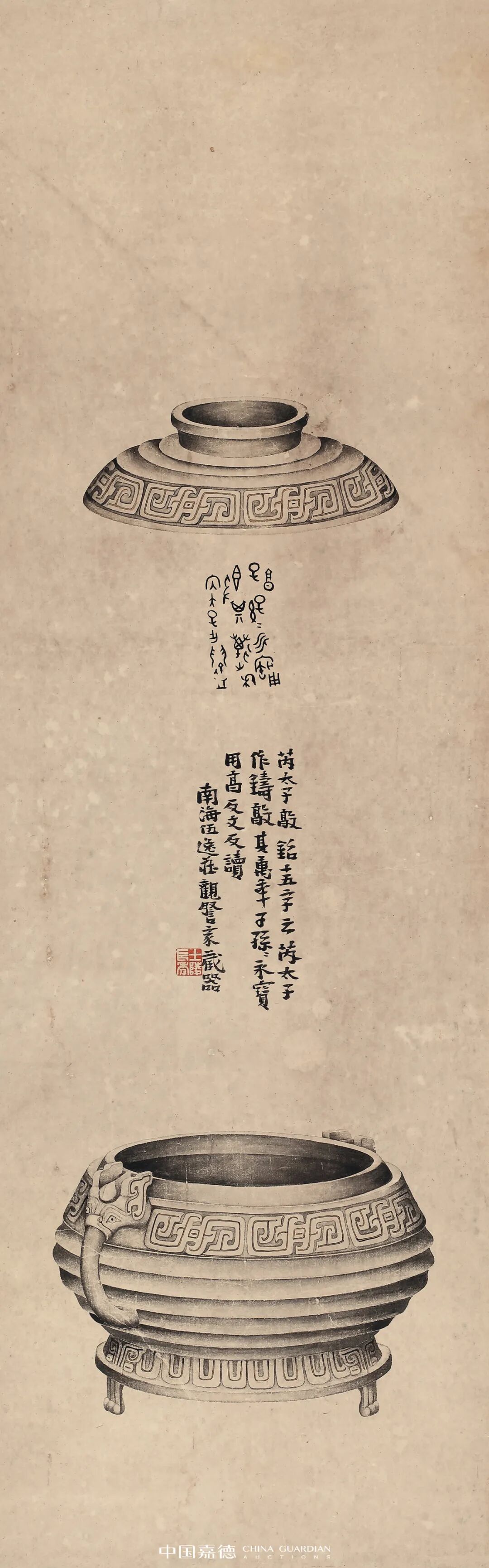 综观黄士陵金石书画艺术,金石博古图是其最具特色的艺术种类,嘉德此次所集四件金石博古图分别为“周伯(君+頁)鼎博古图”、“商蠆鼎等博古图”、“芮太子鼎博古图”、“苗安作簋博古图”。“周伯(君+頁)鼎博古图”见著于罗振玉辑《三代吉金文存》,传世曾见此鼎以释六舟法墨拓全形,此为黄士陵绘画而成,鼎的各部分细节处皆描绘逼真,部分纹饰似用真金钩勒,至今光泽艳丽。黄士陵跋云图见苏州曹氏怀米山房刻石,释文见南海吴氏荺清馆金石录等。“商蠆鼎等博古图”为三鼎集绘之作,“商蠆鼎”出宋王黻《宣和博古图》,“作宝鼎”为潘祖荫攀古楼所藏,前面的鼎为吴大澂恒斋藏器,1893年中秋季节黄士陵44岁时作于广雅书局校书堂。整纸安排商鼎居中偏右,另外二鼎前后重叠偏左,左侧长跋考释,鼎铭各摹于器上、下或侧,是以视觉效果平衡中见虚实对比。三鼎造型精准,画工细腻,尤其色彩烘染出三鼎的光影变幻,如见真器。