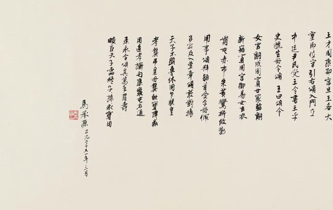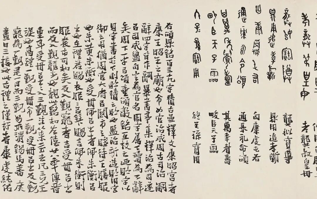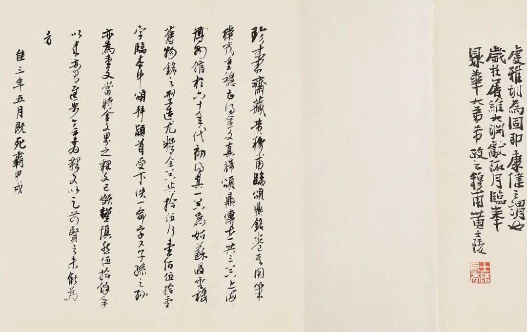 临西周颂鼎手卷作于1899年正月,是年黄士陵51岁,黄士陵临书之下并注楷书释文,再作考跋云:“右颂鼎铭百四十九,积古斋释文,康昭宫者康王昭王之庙也……”接着著名考古学家、古文字学家、文物鉴定专家、原上海博物馆馆长马承源先生于2001年3月作跋曰:“珍秦斋藏黄穆甫临颂鼎鼎铭卷,其用笔朴茂重稳,甚得金文真谛。颂鼎传世共三器,上海博物馆於六十年代初得其一器,为姑苏过云楼旧物……”传世金石书画之珍在于作品的艺术表现力及作品丰富的文化内涵,在于作品的流传有绪,在于作品鉴赏递藏过程中文士的考跋记录痕迹。此黄士陵临西周颂鼎铭文不仅仅是一件临摹作品,其百年前金石家对此器考释的观点对今天研究颂鼎本体及晚清金石学发展状况有着重要的意义,再者原藏珍秦斋又得马承源先生长跋,当然是精品珍本了。
